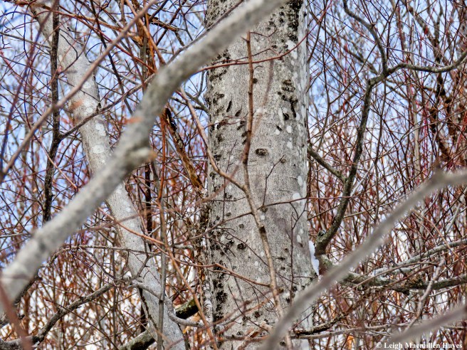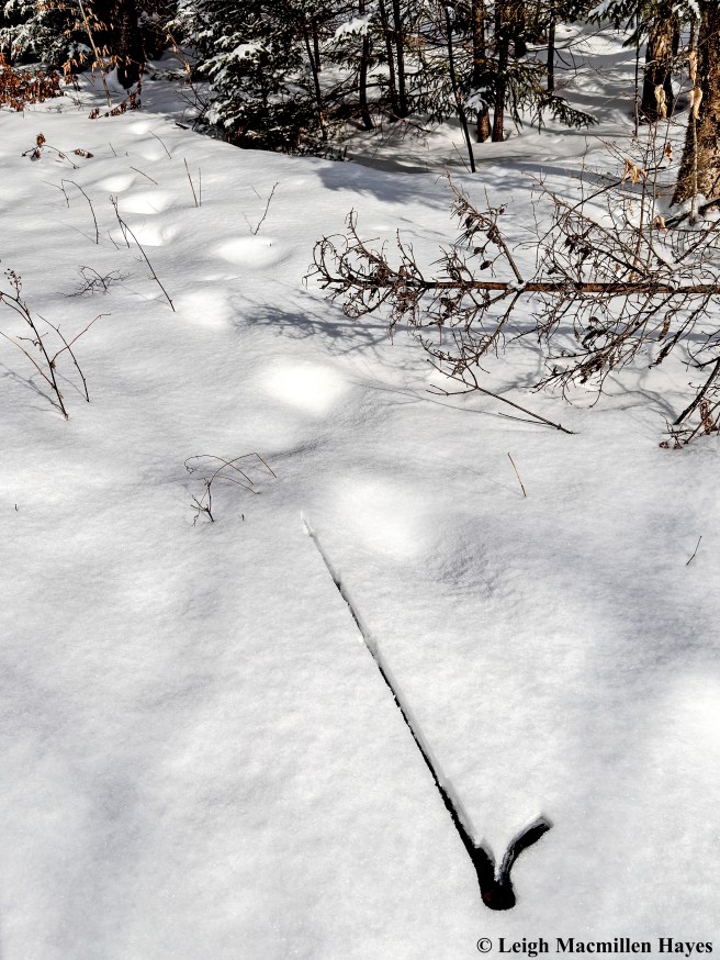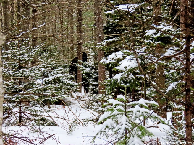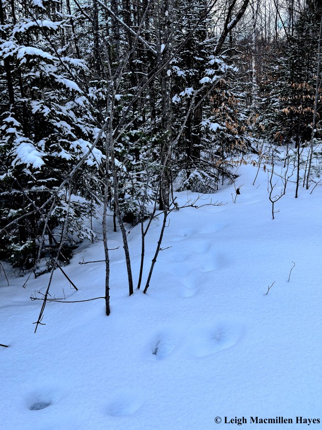 Ah, but next we found evidence of another with big feet. Would we see the creator? We weren’t too worried about this one because Black Bears are in dens at this point. Though we have witnessed their tracks in February on Blueberry Mountain, which is just up the road, so there’s always a possibility that a young male may decide that his den of choice wasn’t all that great and he could go in search of another place to hang out for a couple of months.