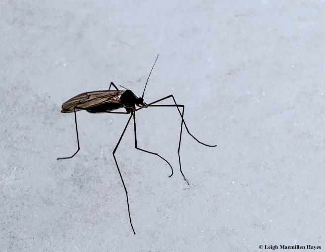 We started paying attention to every little thing–looking for clues. And so it came as no surprise that we found this oversized creature of the North woods–a Winter Crane Fly. But my, what little feet it had. Maybe because in reality, it is less than an inch in length.
