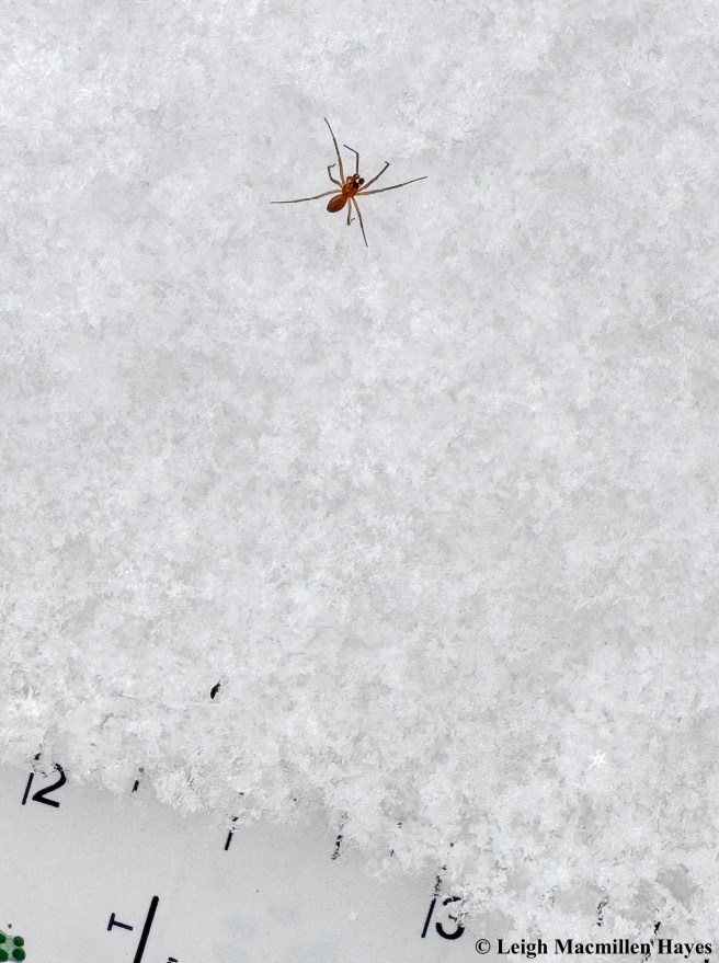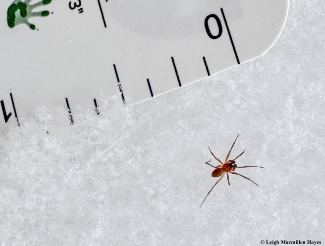 And then another creature garnered our attention–this one even smaller, being a Dwarf Sheet Weaver Spider–and male to boot–look at those boxing gloves on its pedipalps.