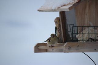 Sometimes it’s the action right outside my back door that makes me pause as it was on this occasion earlier in the week. A white-breasted nuthatch went through several postures to let the tufted titmouse know that he was in charge. Finally, the titmouse responded.