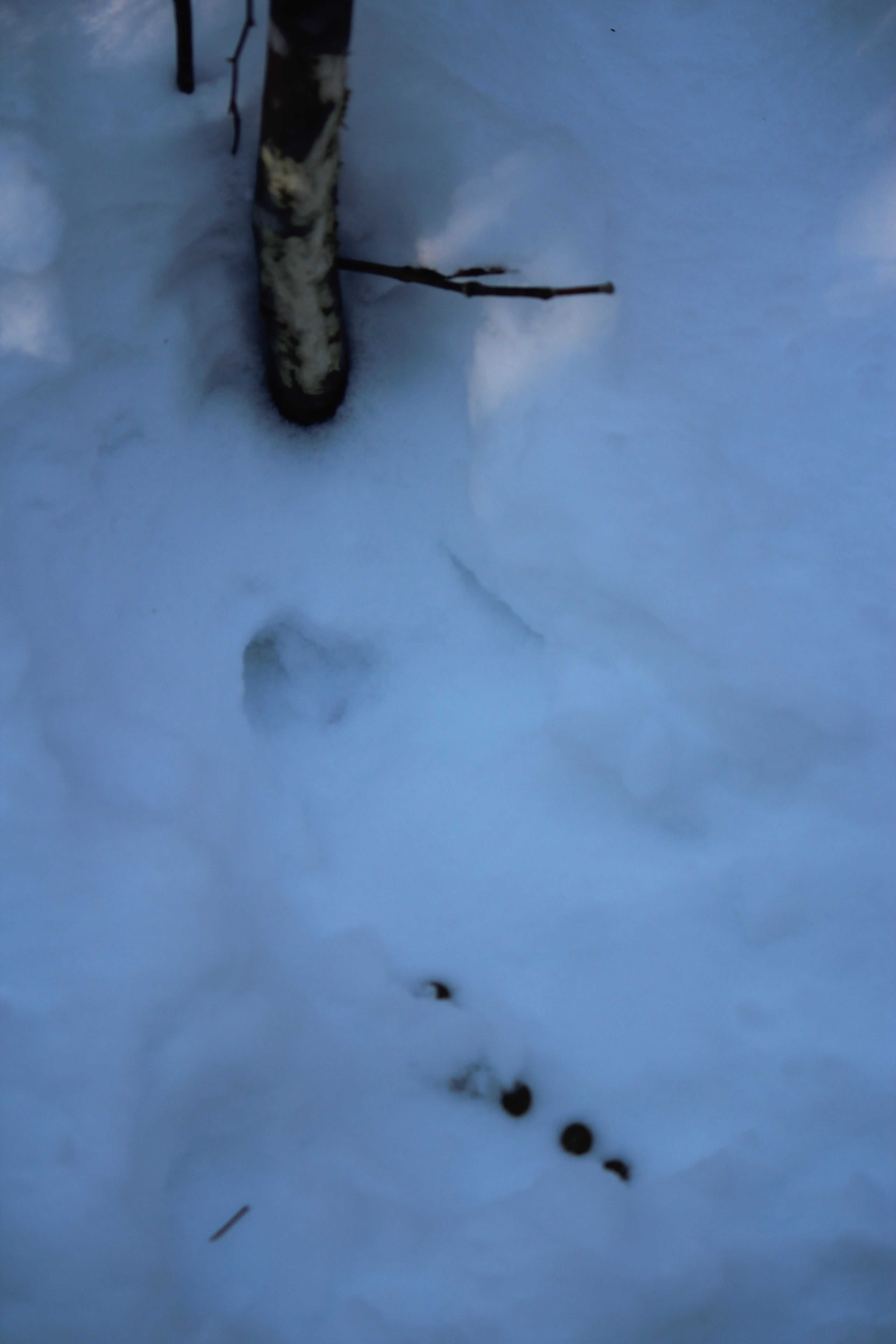 Other animal sign–snowshoe hare runs, scat and chews. Snowshoe hare pack a trail making it easier for them to move across deep snow and we have them to thank for the contraptions we wear–though I should note that today I sank a few times to my thighs. Yup–we’ve got some snow in western Maine. In the winter, hares eat tree buds, twigs and bark.