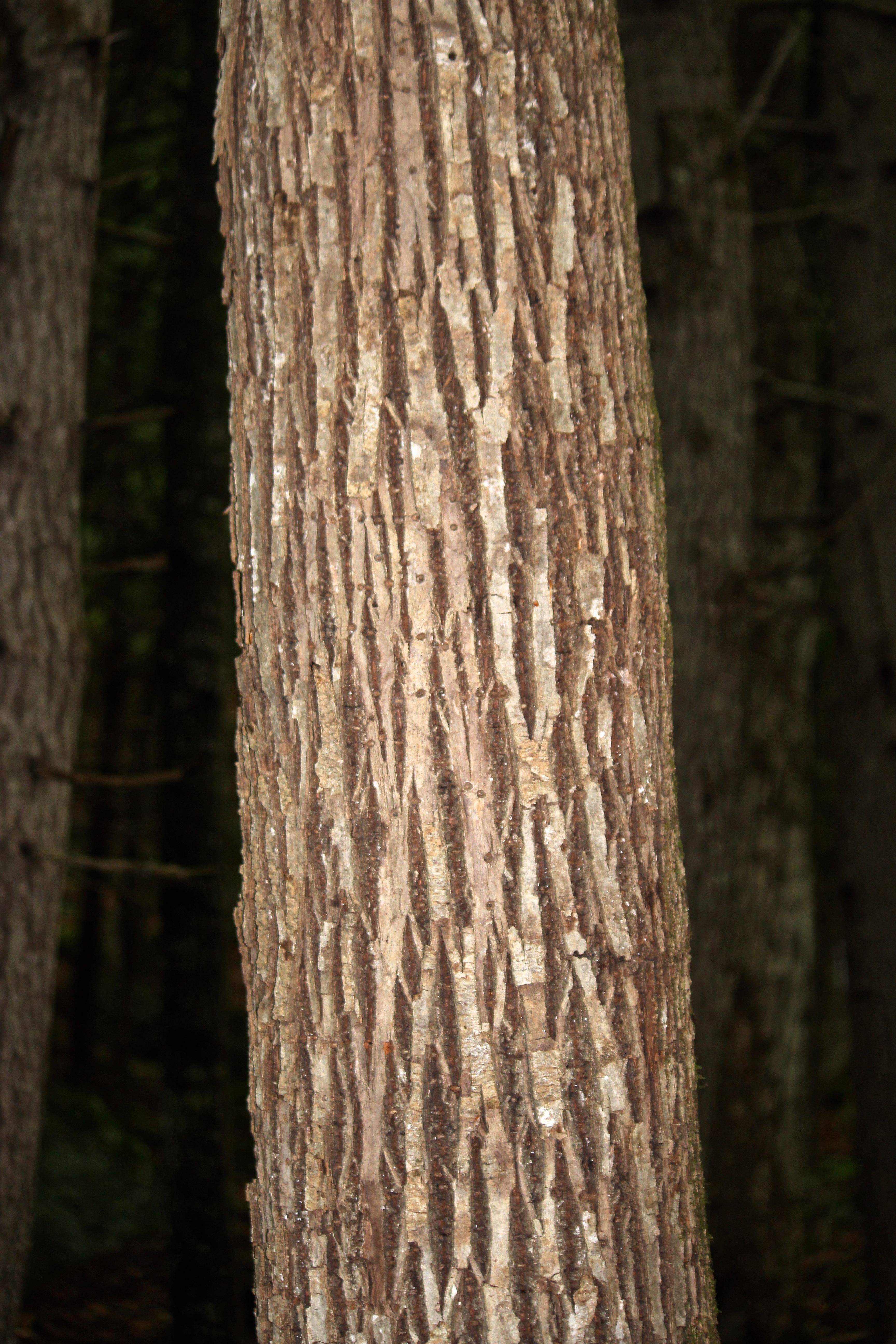 Its flattened, square-like ridges intersect like a woven basket every 6-12 inches. Not only does it look like a basket from the outside, but the inner bark is fibrous and has been used for rope and fish nets and . . . woven baskets.