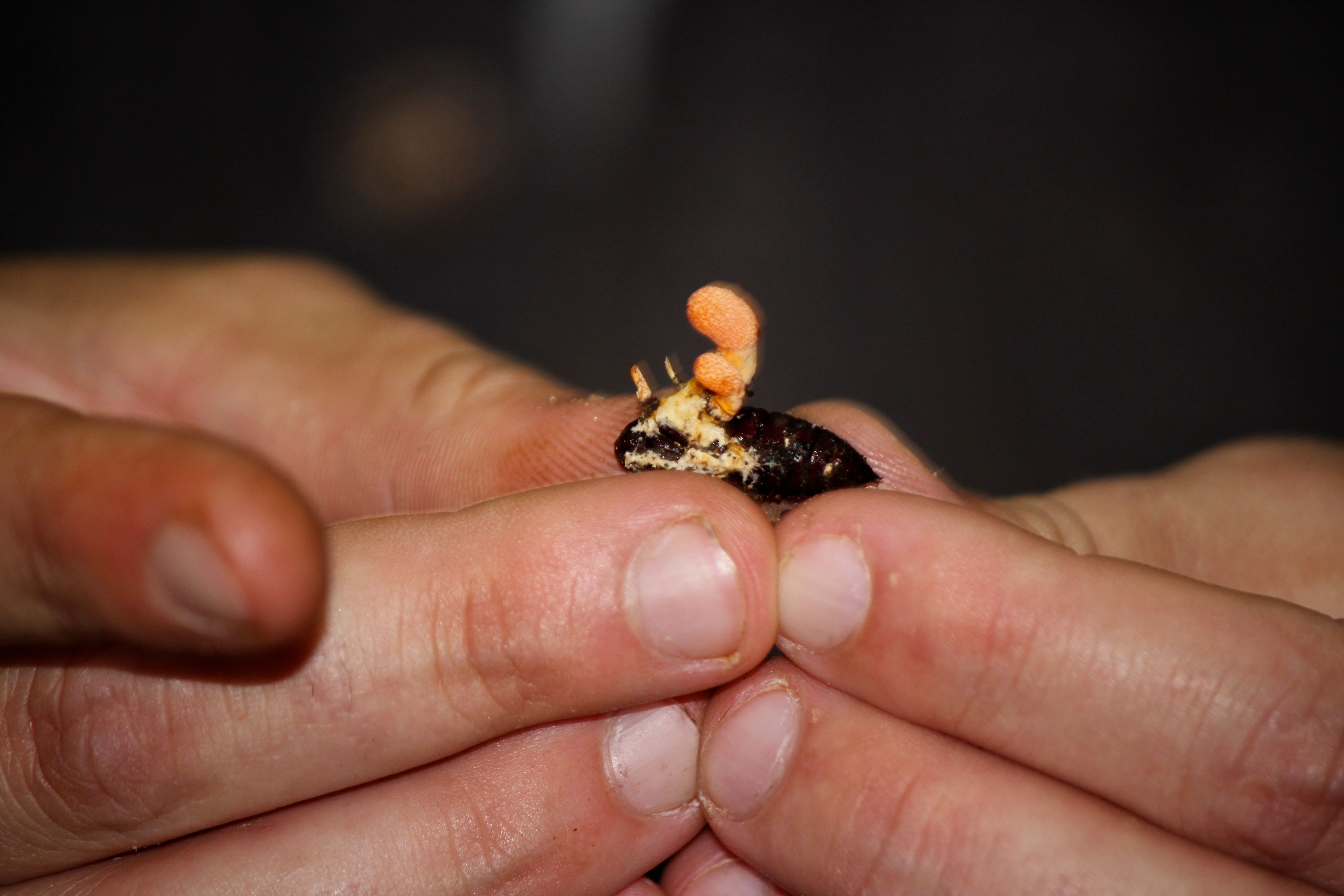 Scarlet Caterpillarclub (Cordyceps militais) feeds off of insect larvae as you can see here. The host provides the most and turns to mush as the fungi grows.