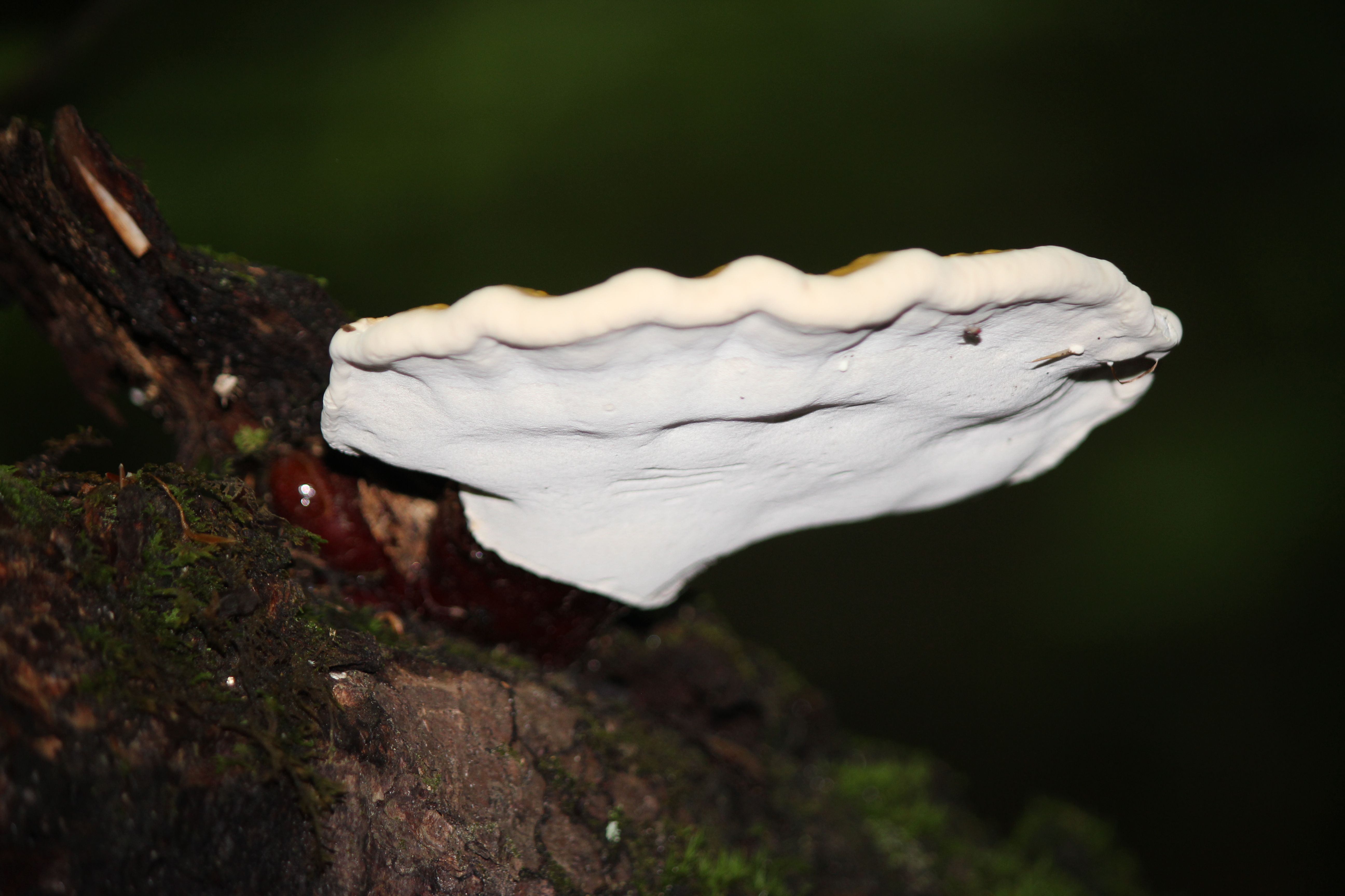 While its shiny, colorful surface and habit of growing on hemlocks and other conifers speak to its name, the oyster-shell rim and non-gilled pore surface are equally attractive.
