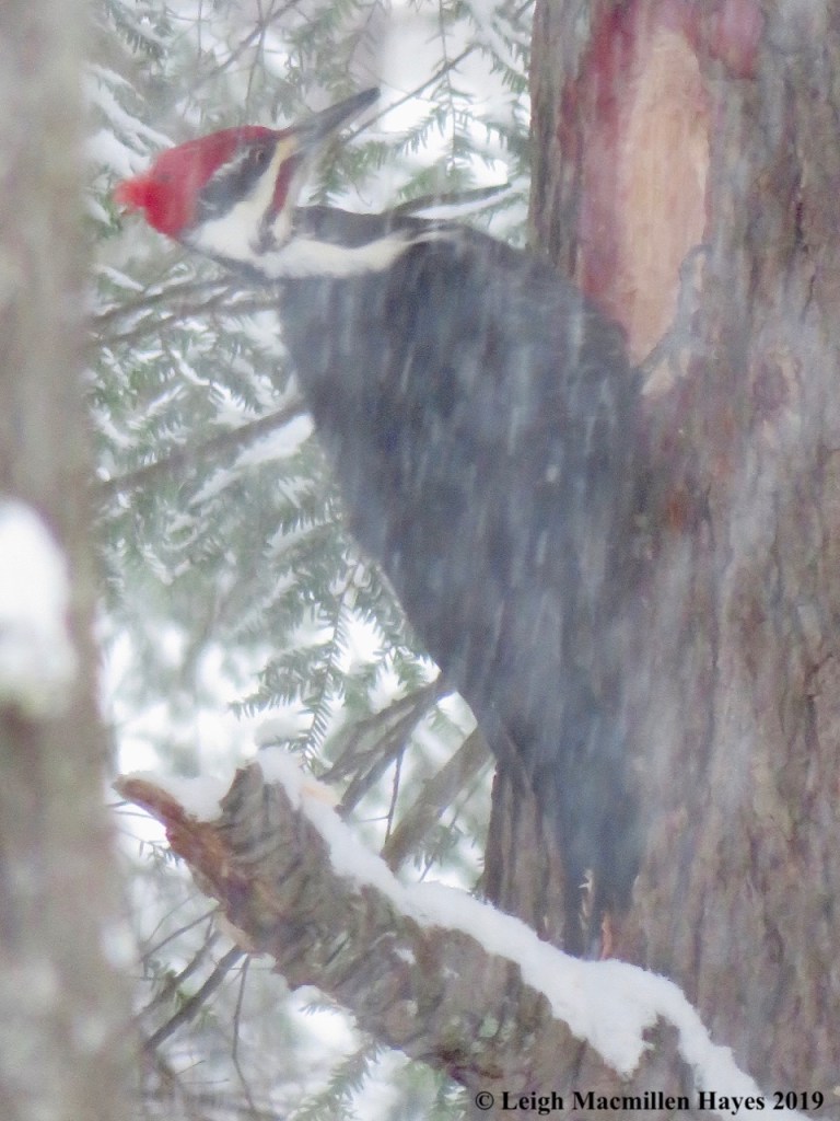 Even in snowstorms, the male Pileated’s excavation work never ceased.