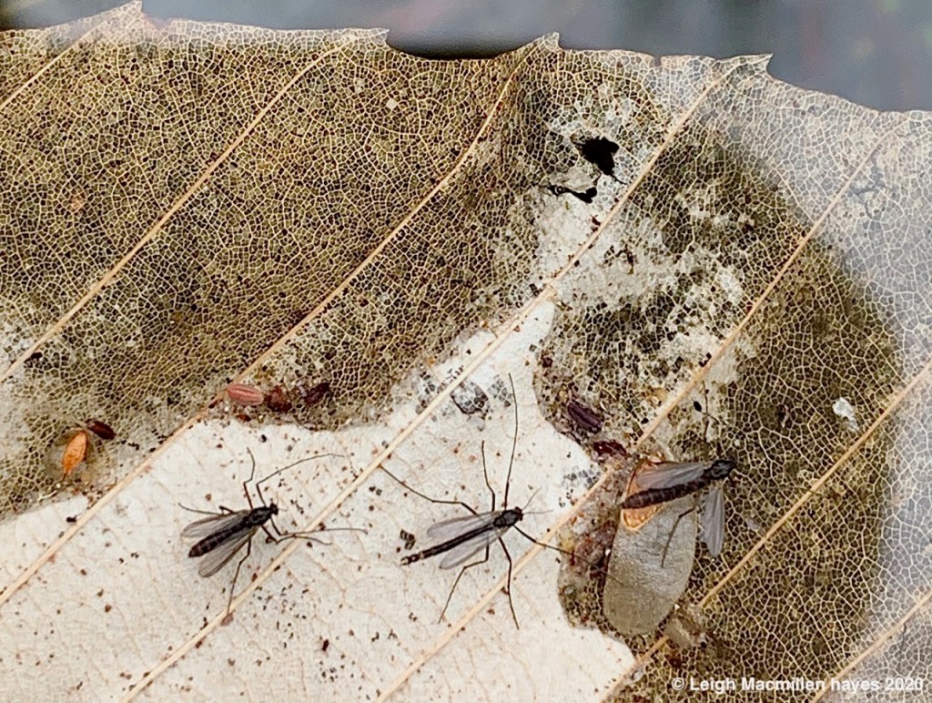 To better understand the size of the midges, note the half inch length of the hemlock needle I drew a line around.