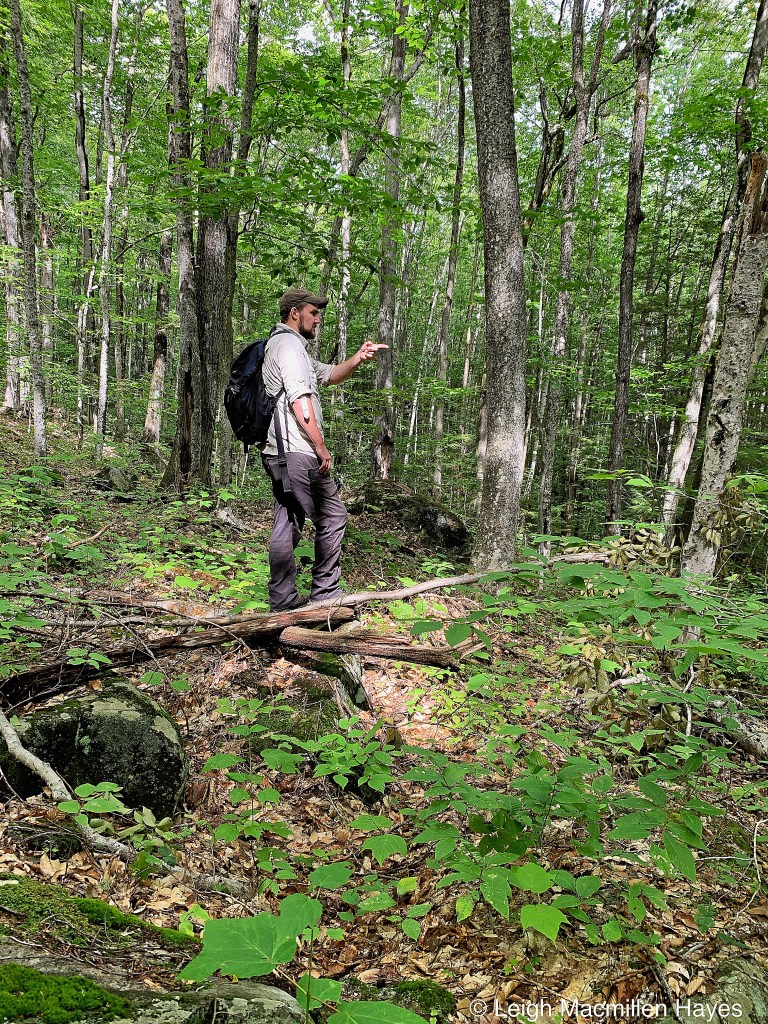 There were others to admire, however, such as the upturned form of the fertilized Indian Pipes. and Rhyan Paquereau, Greater Lovell Land Trust’s new Land Steward, and I didn’t really mind that we couldn’t spot the plant of our attention because we enjoyed the quest. As well as the opportunity to explore off trail together. I gave thanks that I get to work with this young man and learn from and bounce off of him about the wonders of the natural world.