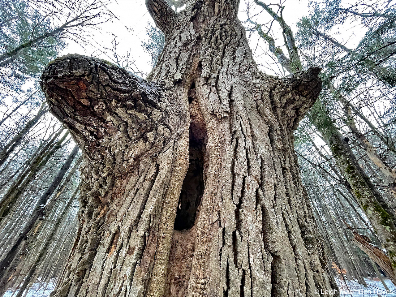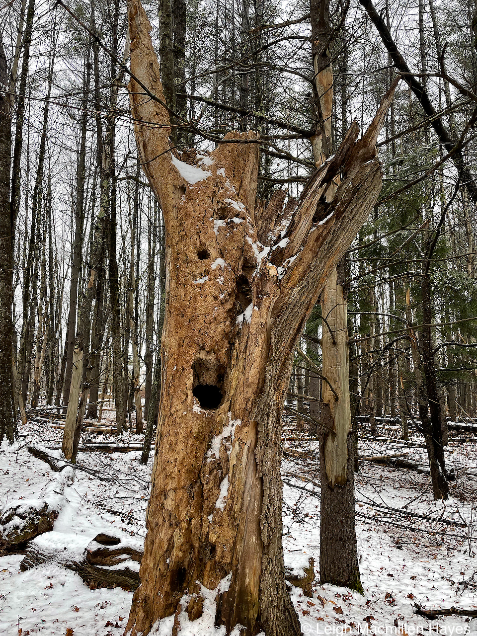 The red squirrel survived. This I know because it left fresh prints that led to a hemlock stand where, though I couldn’t see it, it scolded me from high above. Or perhaps it was telling me a tale of its heroic adventures to outwit the coyotes.