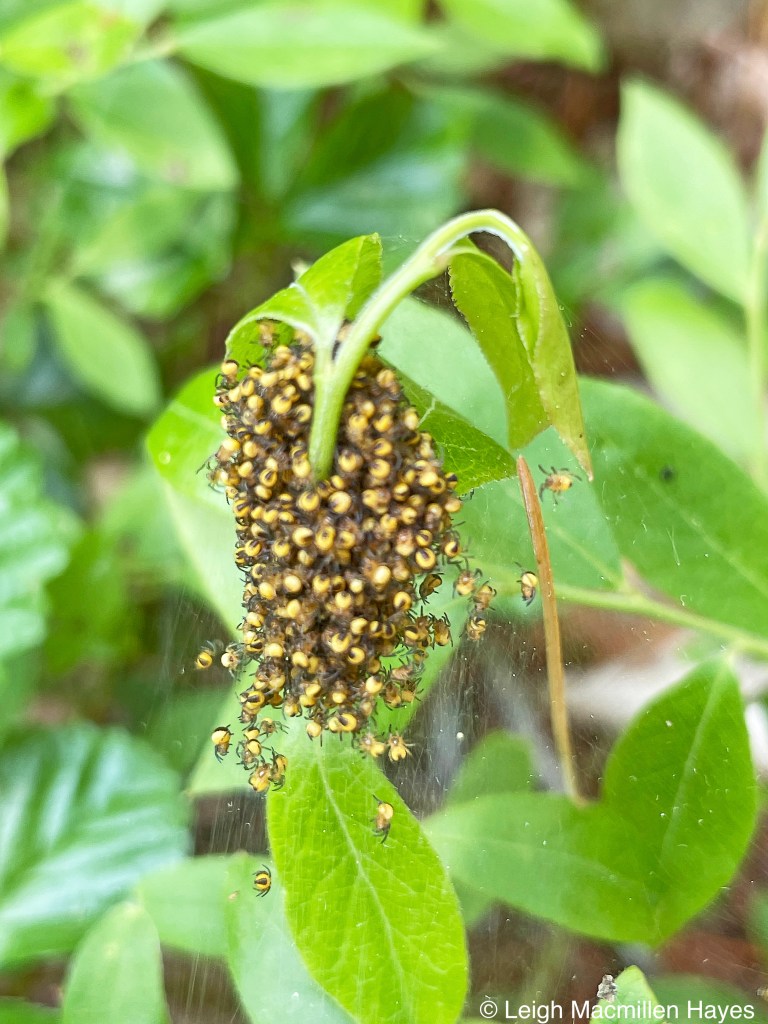 In the same neck of the woods, what appeared to be a flower, turned into a hundred or more spiderlings of the Cross Orb-weaver family. Notice all their guide lines. Such a clever construction.