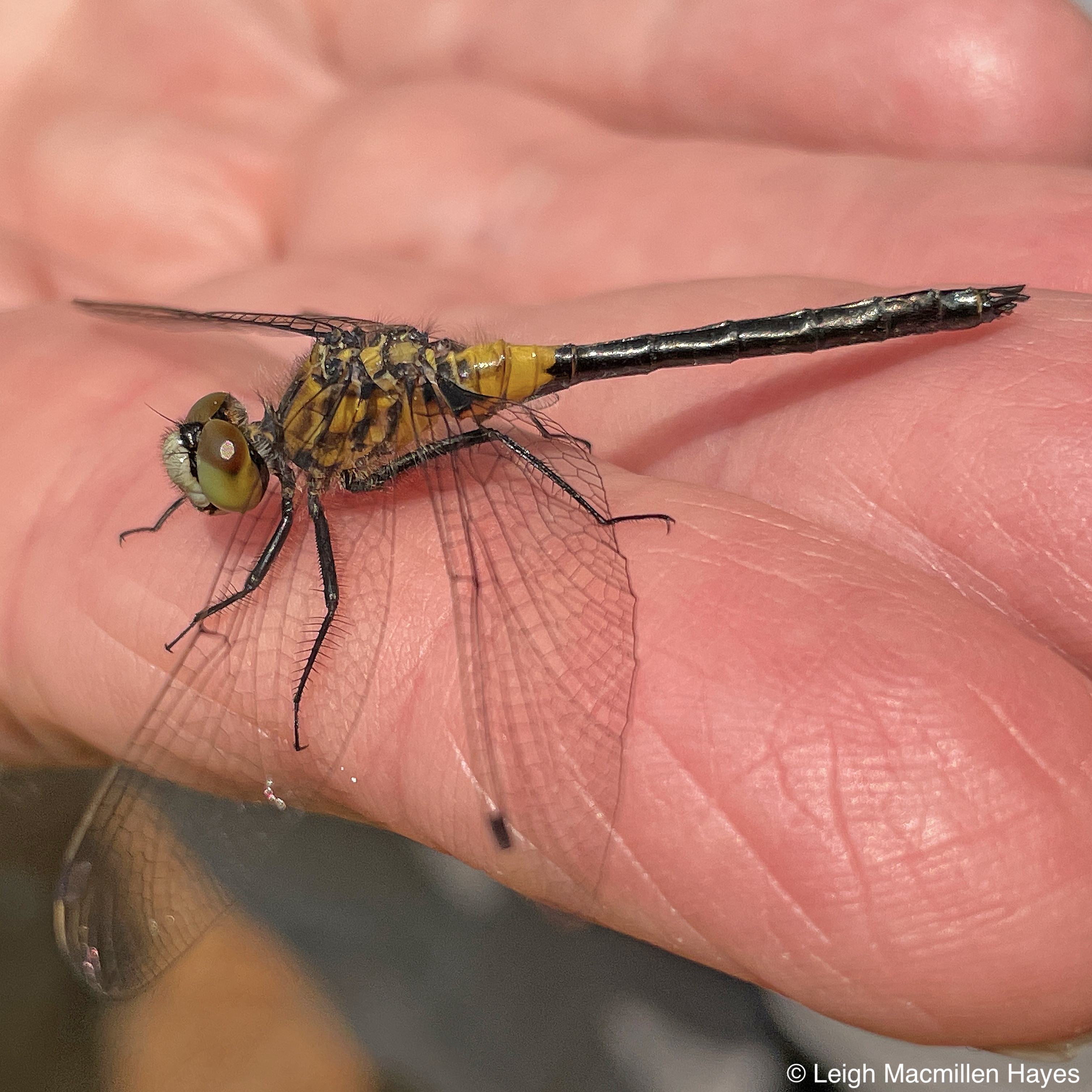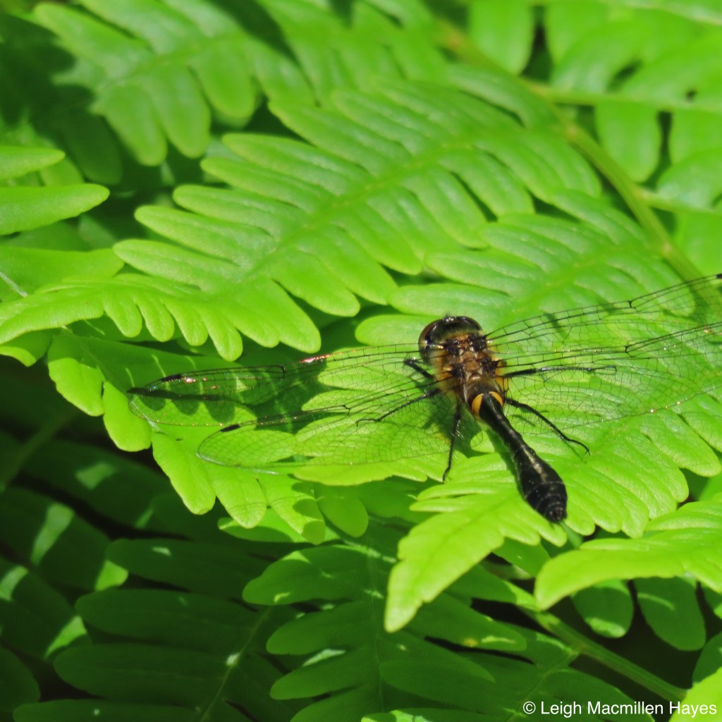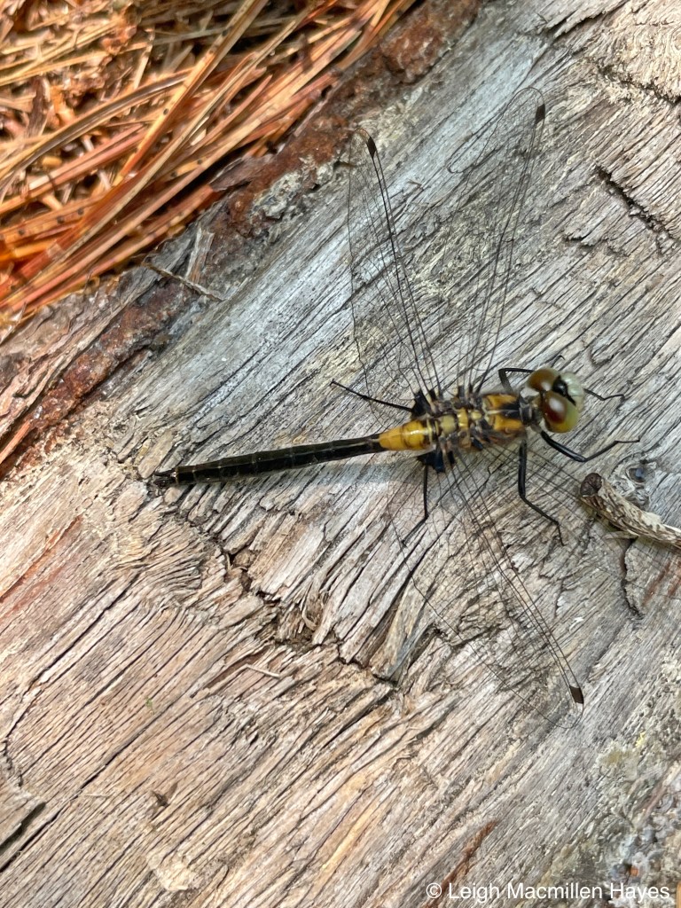 And finally, in that same place, we spent a few moments with an immature male Belted Whiteface Skimmer dragonfly so identified by its yellow thorax and the yellow base to the black abdomen. As it matures, the abdomen will turn brown and then red.