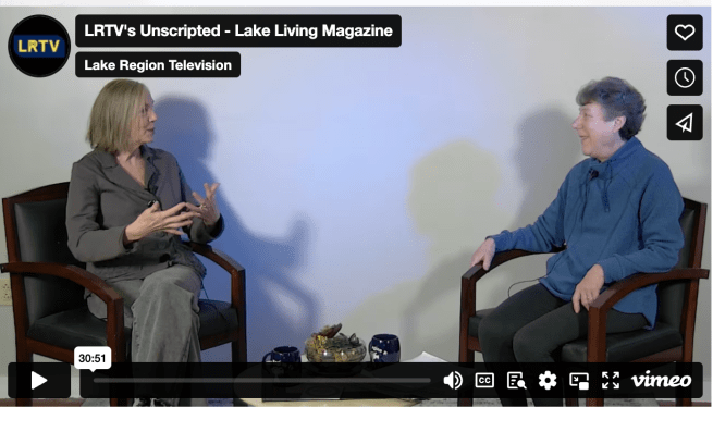 We are movie stars! Well, maybe not quite. But, many, many thanks to Evan Miller of Lake Region Television for filming and editing Laurie LaMountain, owner and publisher of Lake Living magazine, and me recently as we said, “Fare Thee Well,” to working on this publication.