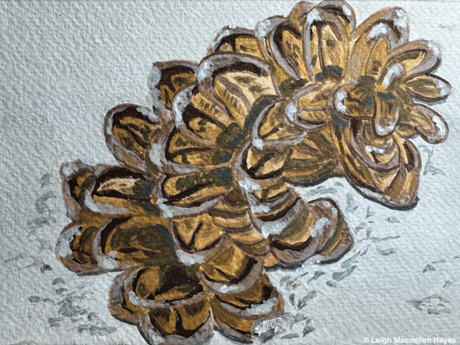 Turns out, I’m not the only one who knows to go about it–for Red Squirrels love to take each pine cone scale off in order to get to the seeds stored by such. Their method of descaling a cone is rather like us eating corn on the cob. I actually referenced both the pine cone painting and this one in Another Amazing Lesson from a Red Squirrel.