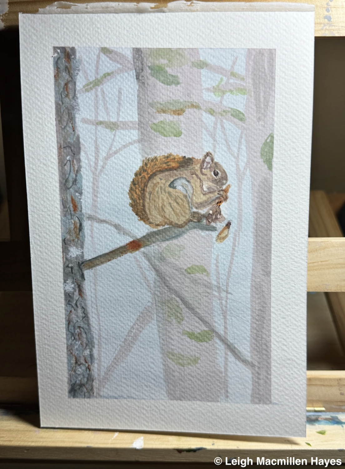 Turns out, I’m not the only one who knows to go about it–for Red Squirrels love to take each pine cone scale off in order to get to the seeds stored by such. Their method of descaling a cone is rather like us eating corn on the cob. I actually referenced both the pine cone painting and this one in Another Amazing Lesson from a Red Squirrel.