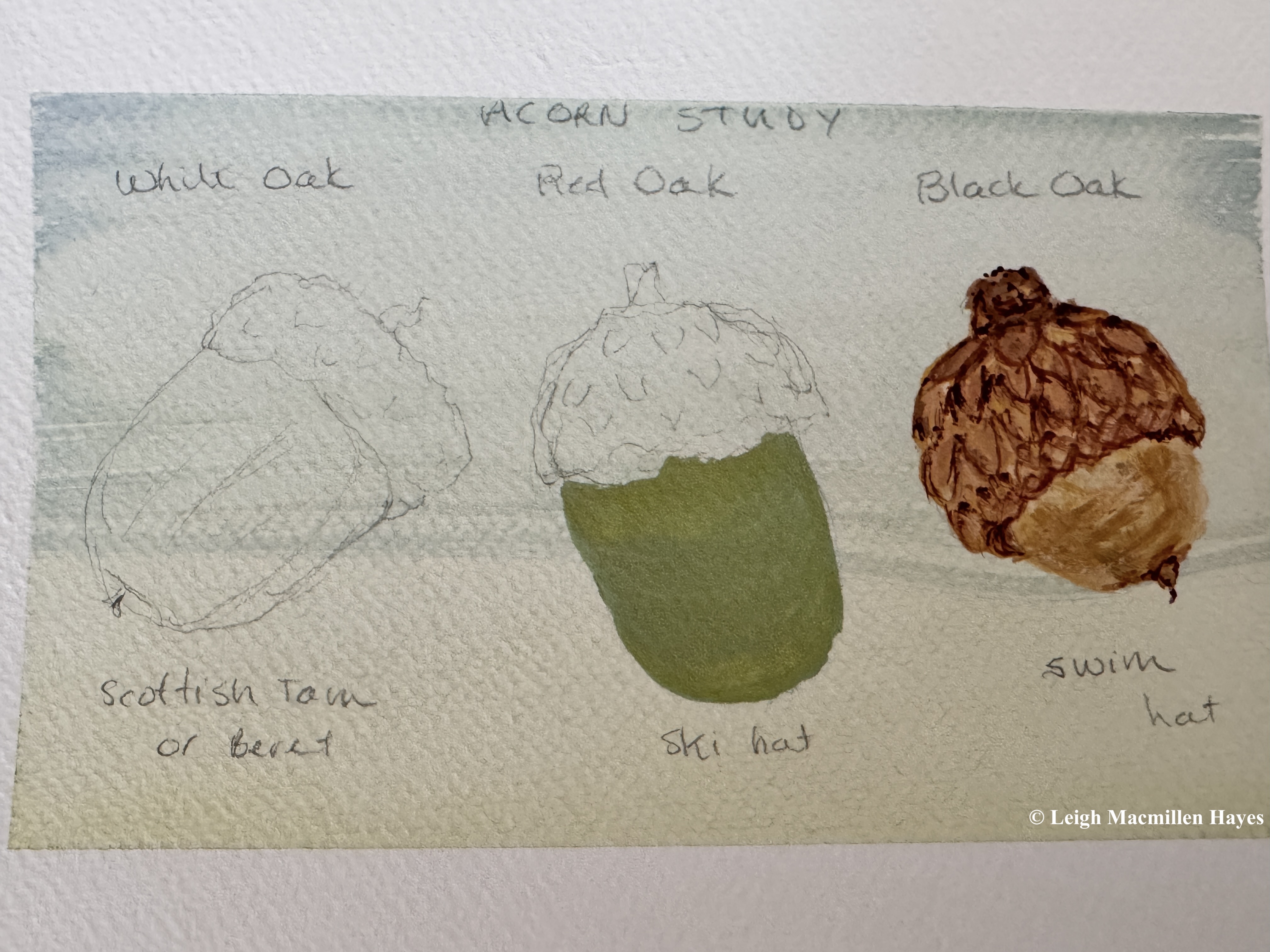 And then there was the day I pulled out a copy of National Audubon’s Field Guide to North American Trees because I wanted to get to know acorns better. Silly me, I came up with names for each one based on what they looked like to me, but I made the mistake of writing the names in pencil before painting a light colored wash on the paper. As I began to paint the acorns, I realized I wanted to change their names, but couldn’t erase them or paint over them. So . . .