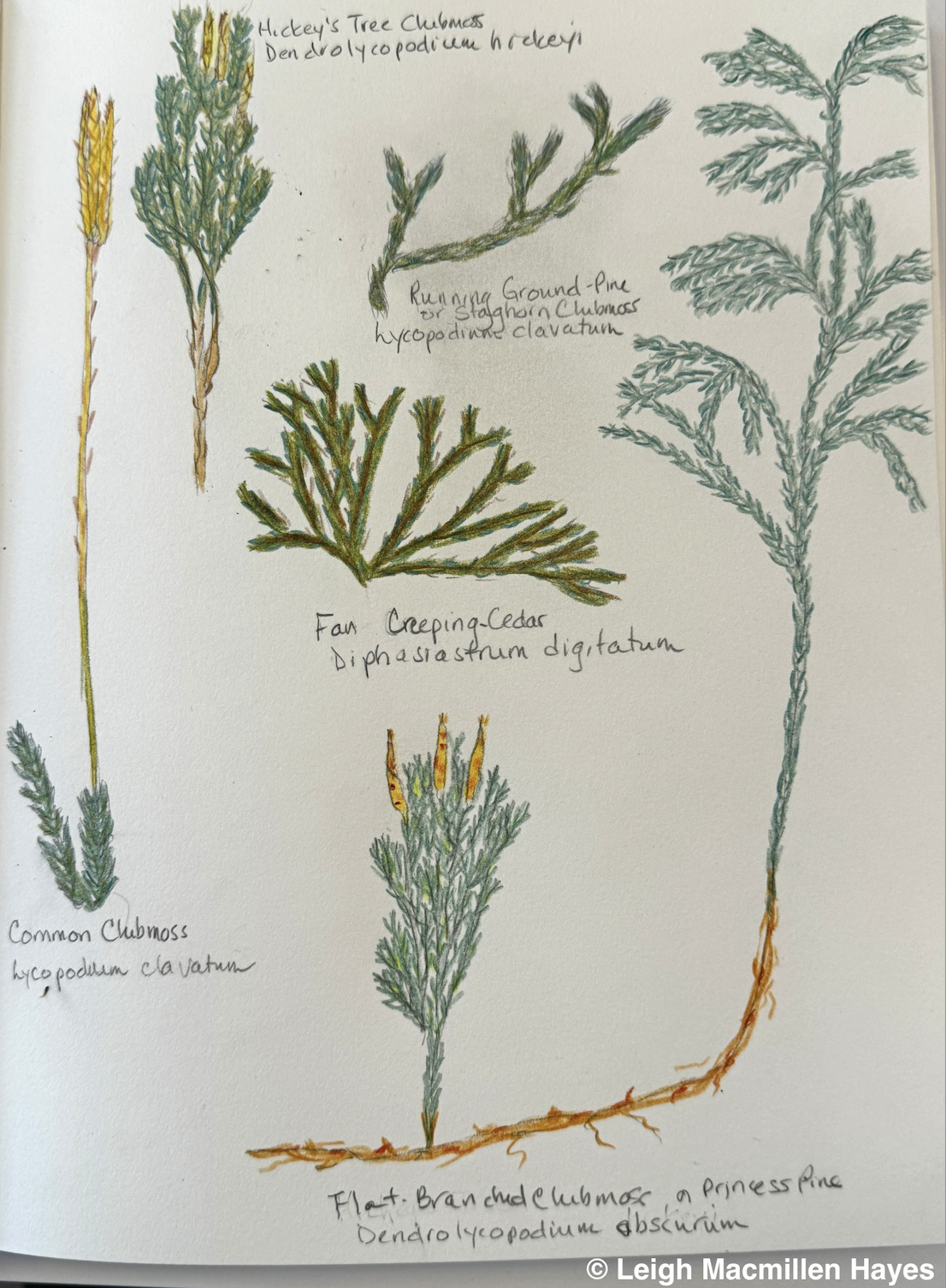 Clubmosses are one of the topics I’m trying to learn. . .when I take the time to do so. And so I sketched these after spending some delightful hours studying them as I wrote about in When is a Moss not a Moss?