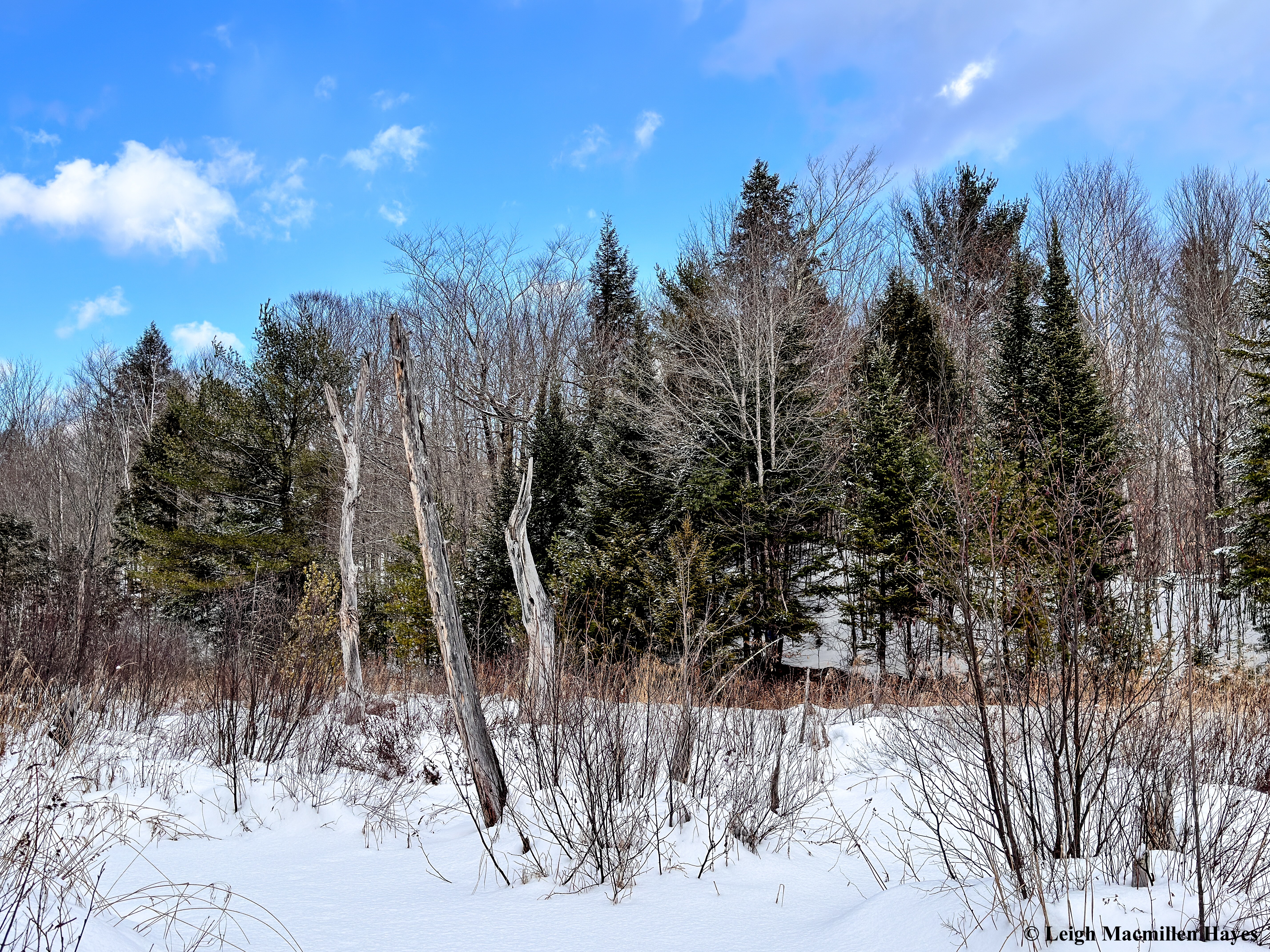 We kept noticing the tracks of Snowshoe Hare and Squirrels and Coyotes and Foxes, the latter two sometimes traveling as if they were one and then suddenly splitting up for a minute before coming back together again, walking in the snow on the spot where the first in line had already packed it down.