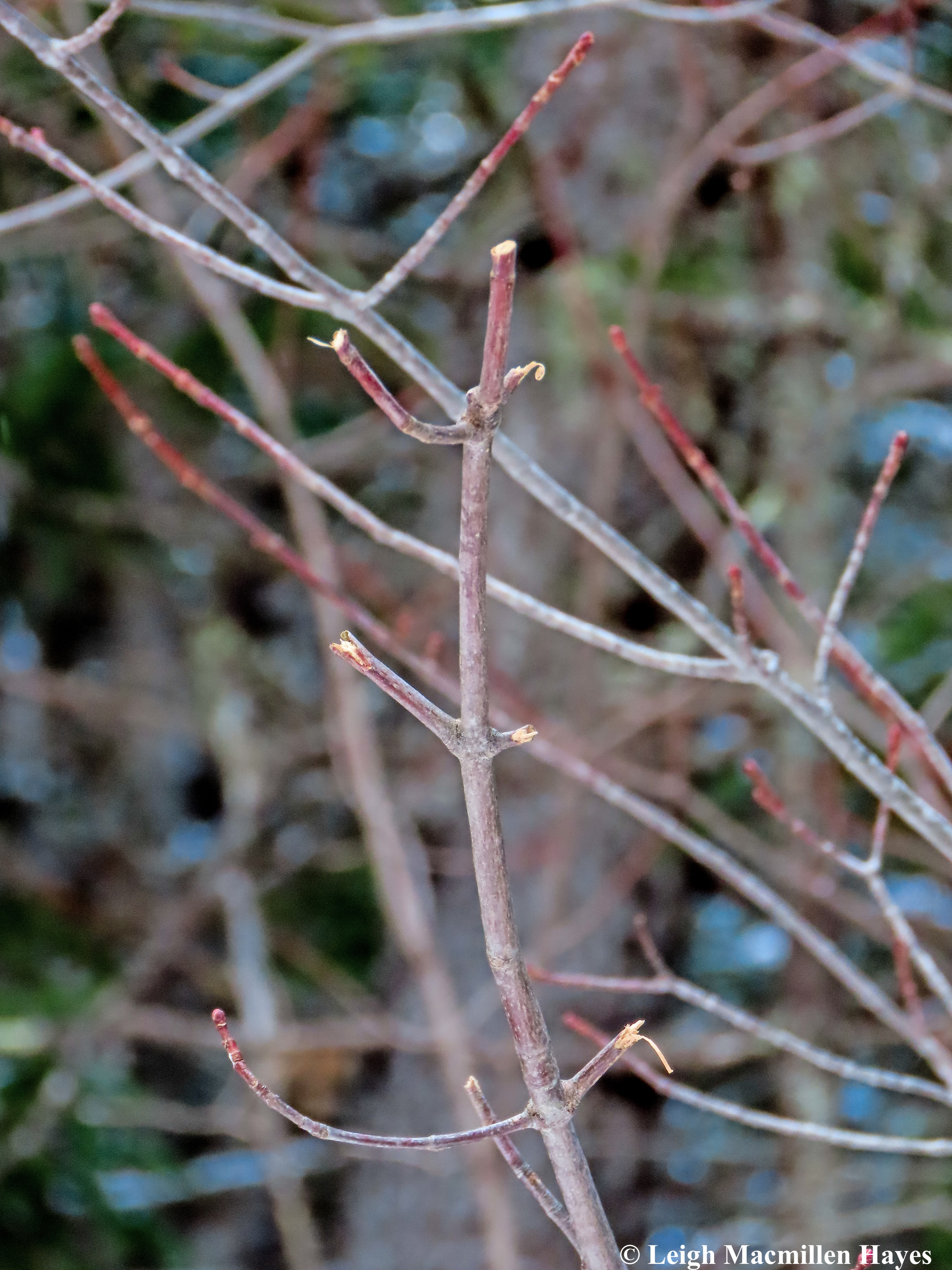 And above the foot prints–missing buds from Red Maples at about 7 feet up the sapling. With little tags where the creature had torn the buds and part of the twig off because it has no upper incisors, but rather a hard palate and yanks with its lower incisors pushed against that dental pad, leaving behind ragged wood.
