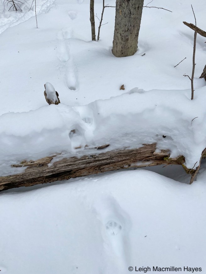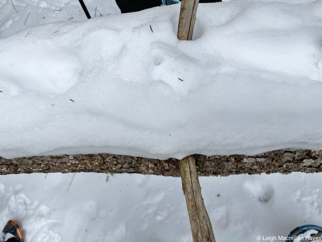 A few years ago, some of us followed one as it led us past a Porcupine high up in a Hemlock and Bear hair stuck to resin on Balsam Fir. And then we reached the broken off part of an old snag that acted as an inclined balance beam.