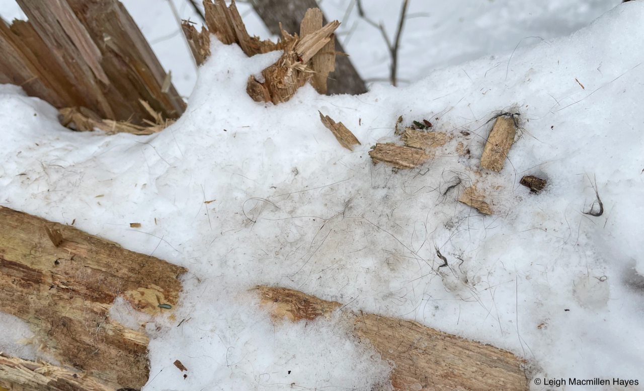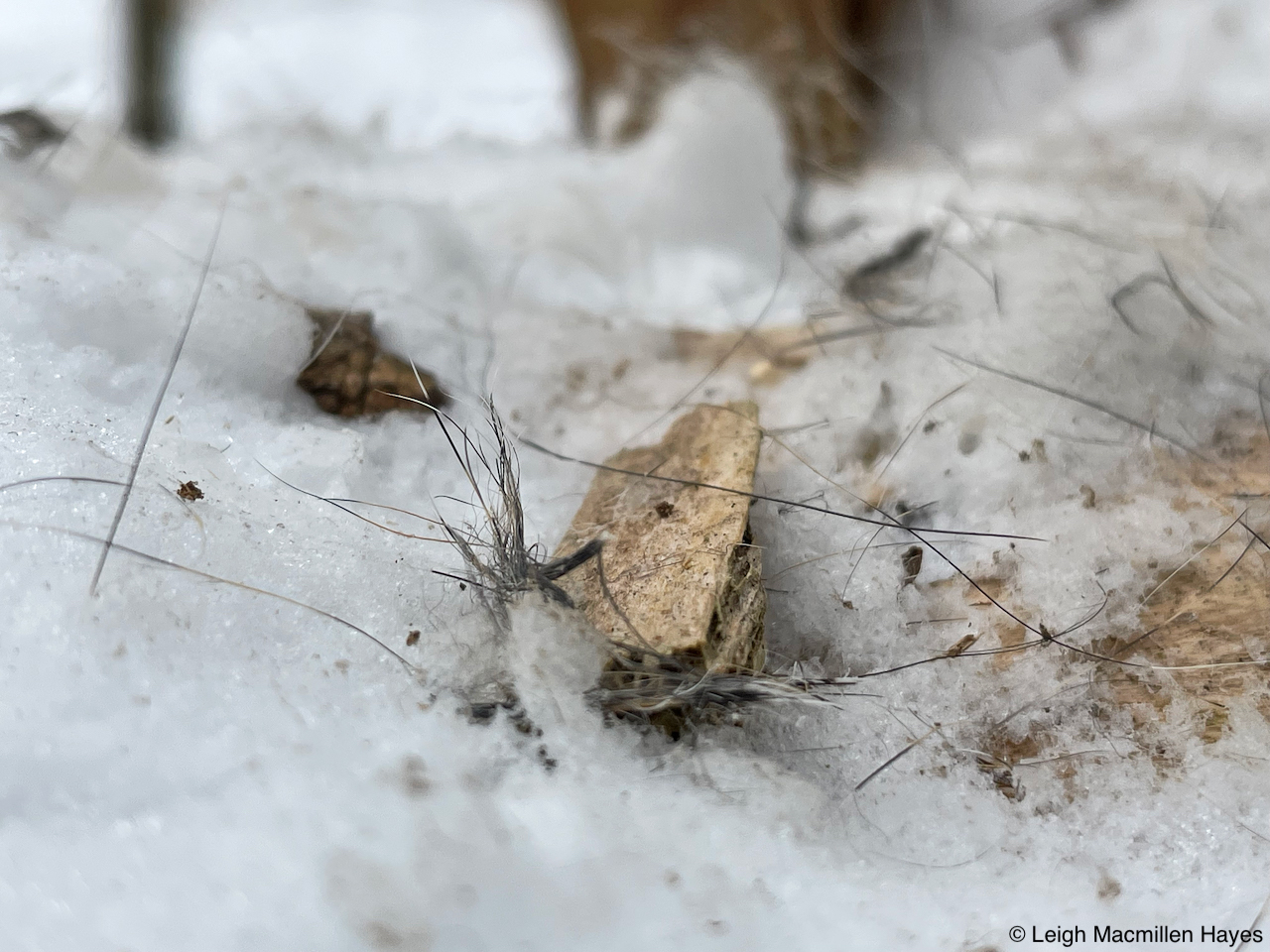 Did it cache something in this spot at the top of the trunk beam? No, it sat. For quite a while. Probably watching all the action of the woods from this vantage point. And leaving behind evidence of its warm body–melted and colored snow, plus hair.