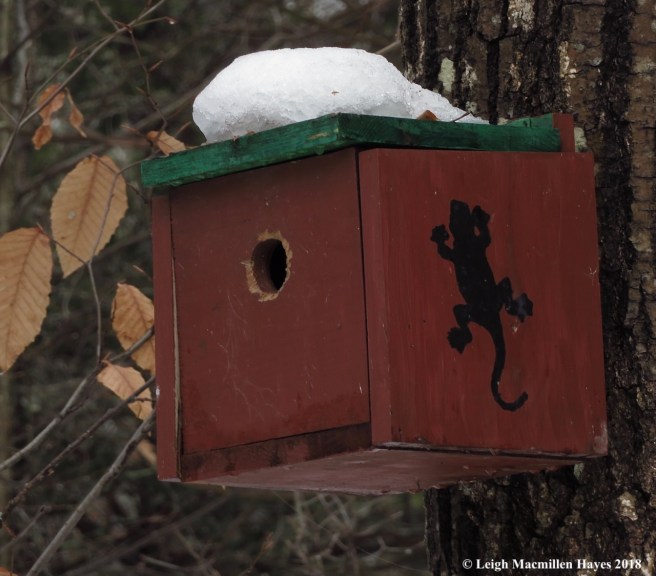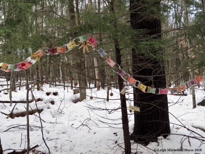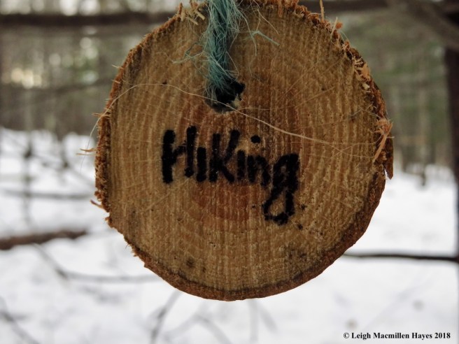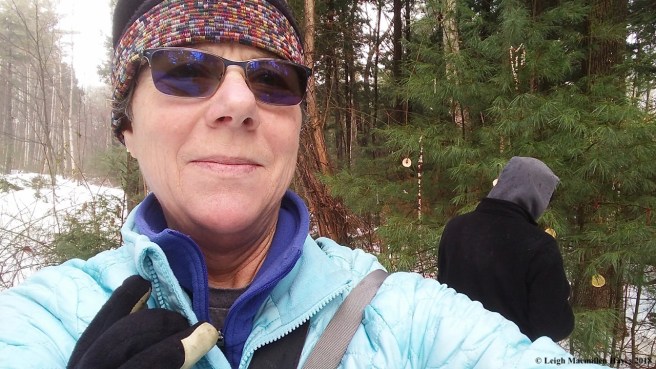 Our final destination was to Lake Environmental Association’s Pinehaven Trail at the Maine Lake Science Center on Willet Road in Bridgton. This is a place we know well for it’s practically in our backyard, but we didn’t know which tree would be decorated. And so we began our hunt, pausing briefly to remember the fun we’d had on the low elements challenge course that dots the trail. We’d actually completed that challenge one rainy day and were thankful (and surprised) we didn’t have to attempt it in the snow.