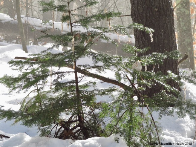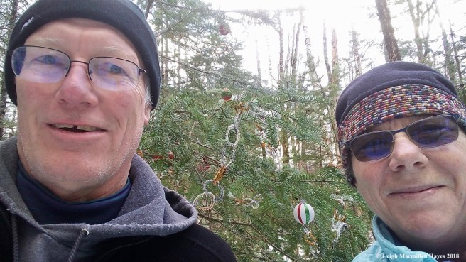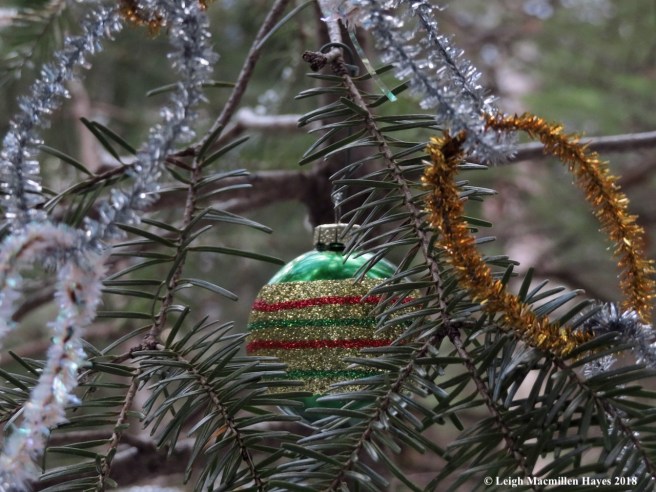 Because we knew right where to go, our journey was quick and we easily relocated the tree on the one mile loop with a spur. And . . . discovered that the birds and deer had once again dined on the bird seed ornaments.