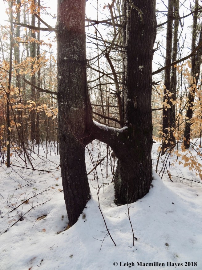 Our starting point on this very foggy morning was Western Foothill Land Trust’s Roberts Farm Preserve in Norway, Maine. As instructed, we arrived at 10:30 and made sure to stay on the snowshoe trails only, for there is also a network of groomed ski trails. The trail was long and sometimes wet, while other times icy, but we didn’t notice too much as our eyes were focused on the trees. Of course, we were occasionally distracted, such as when a downy woodpecker flew into sight.