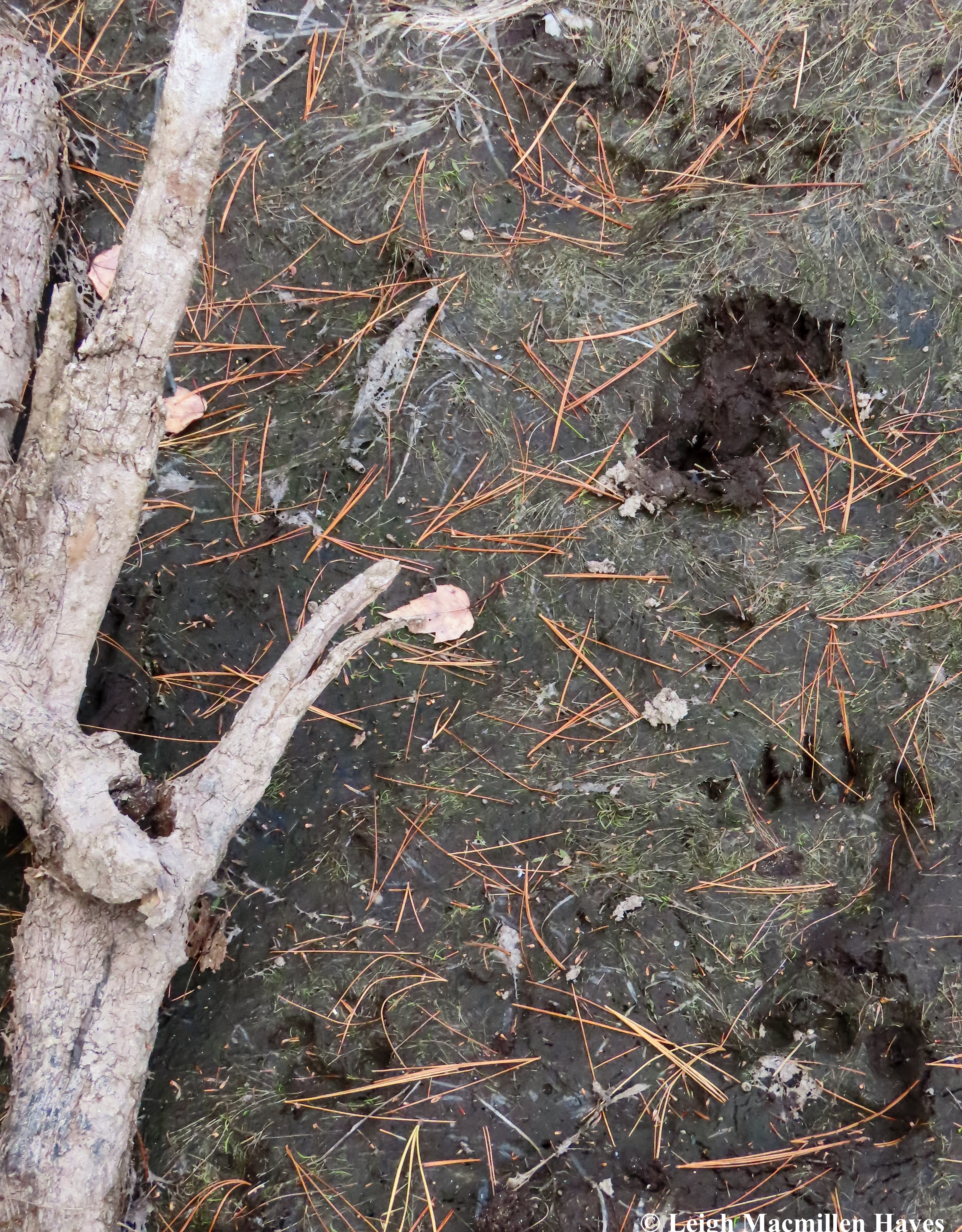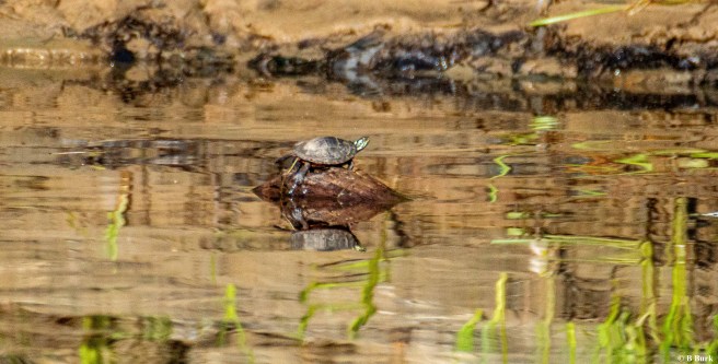 Meanwhile, the Merganser had moved to another part of the pond, but the Red-eared Slider maintained its position and I gave thanks for the opportunity to see it basking, even on a day with the temp in the low 40˚s.