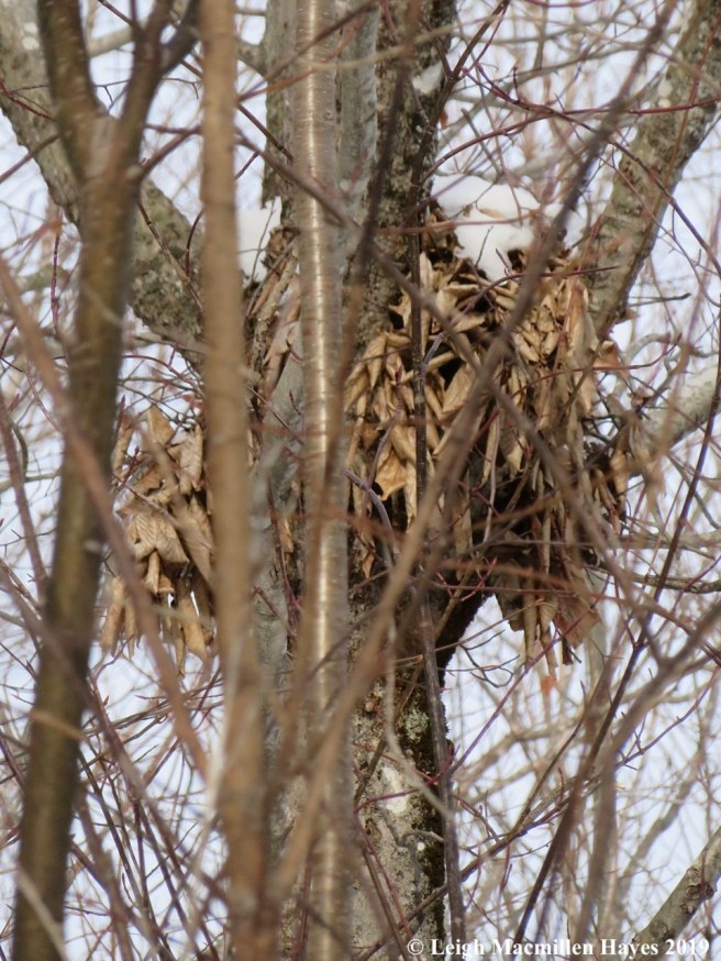 And others that hosted squirrels who had built dreys appearing haphazard in construction from our stance about thirty feet below, but were really complex and apparently well insulated.
