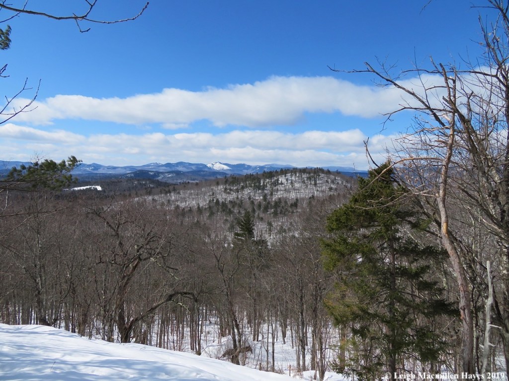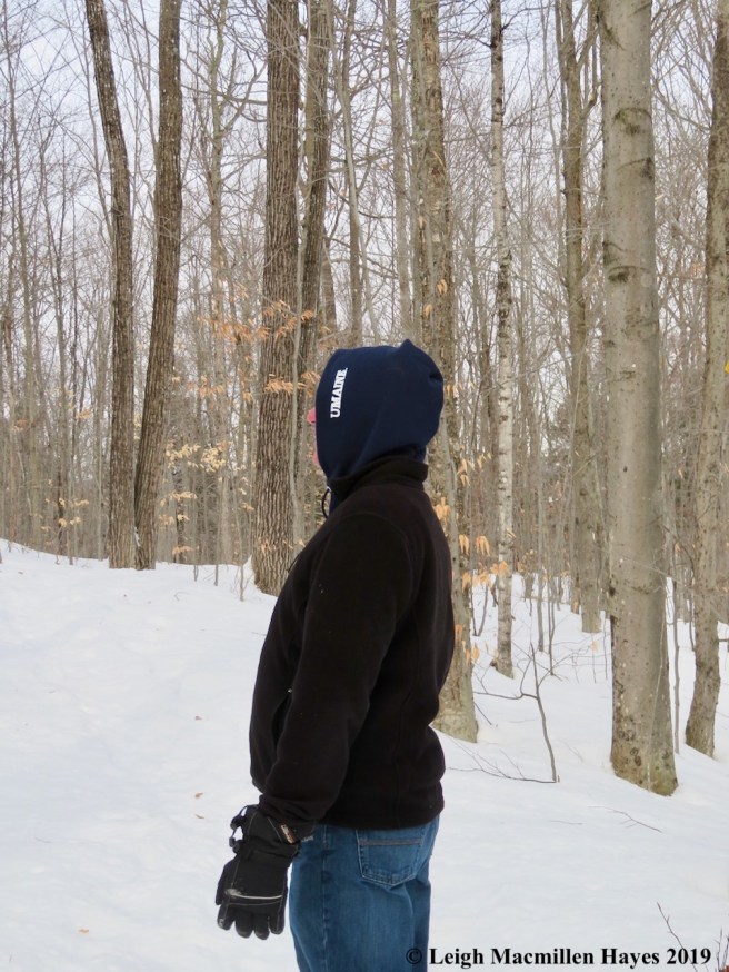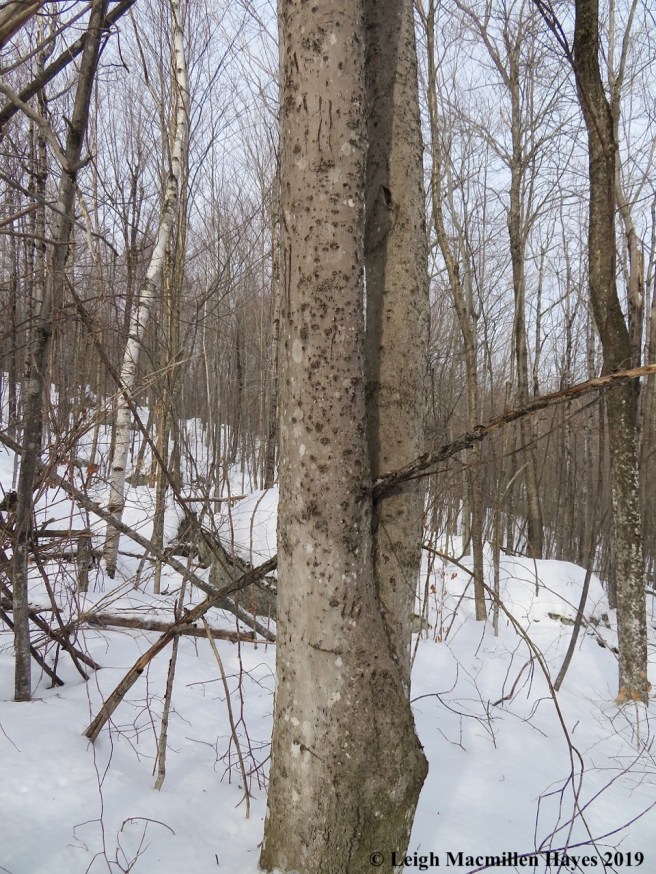 We continued to look for bear trees but found no others. That being said, there were plenty of beech trees on the Peaked Mountain Trail, but the sun was in our eyes for much of the journey, and we had to pay attention to where we placed our feet because traveling was a bit slippery given the soft snow. Maybe there were others after all, and we just didn’t notice.