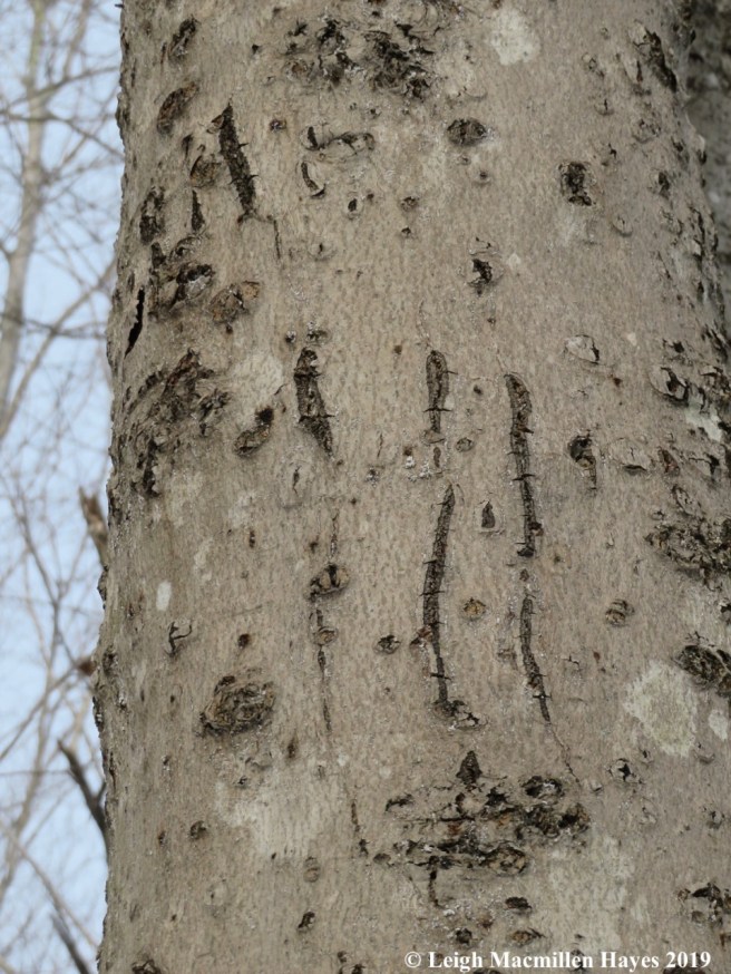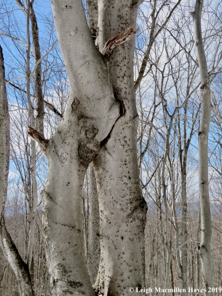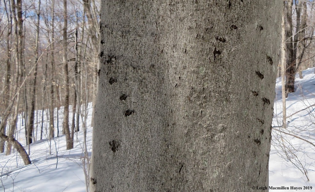 We scanned the bark every time we spied a beech, and saw not a nail scrape anywhere. But . . . sad to say we did notice tarry spots which oozed out of the cracks in the bark caused by cankers a tree develops as a defensive attempt to ward off beech scale insects and the nectria pathogens that follow their entry points.