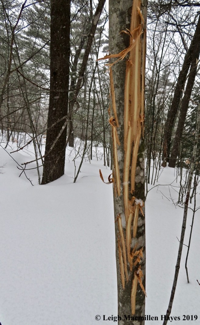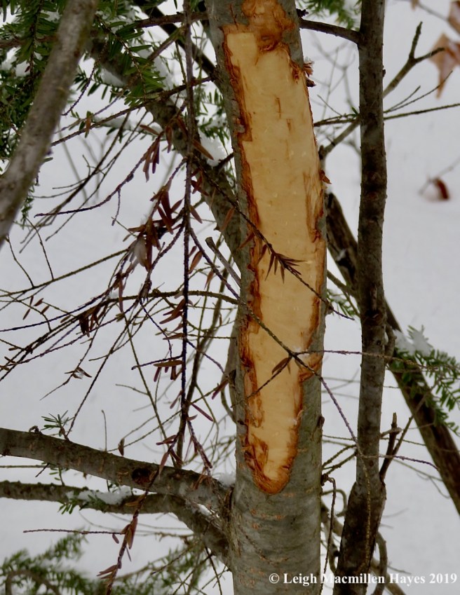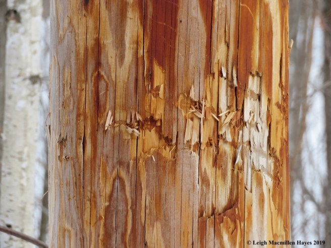 At last we’d completed our journey and relished our success. As I drove back down Sodom Road in Buckfield, I knew there were a few final trees that needed to be examined–telephone pole trees. Most were in great shape, but one close to the preserve had been visited by a large furry mammal that scratched it and nipped it and probably left a scent on it.
