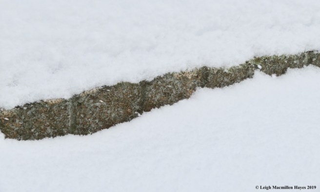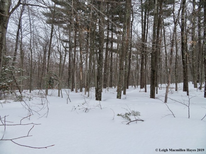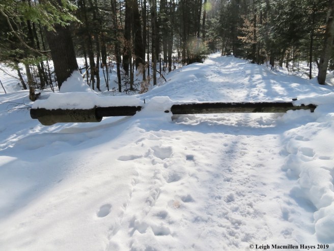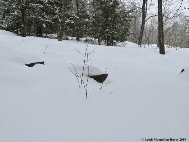 Not far down the snowmobile trail, we turned left at a stone wall, the same as we had during the LELT walk in late January. I was sure this was a route new to my guy, but it turns out it used the be the snowmobile trail and so he knew it. Right away, as we hobbled over and pulled up some downed trees, we began to see a variety of mammal prints muffled by the morning’s snow. Both prey and predator make their homes there and the property’s importance as part of the animal corridor was obvious.