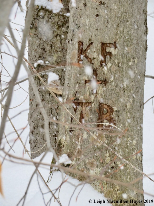 Closer to the trail, we did find another tree with bear sign–left behind by Teddy Bear and K.F., whoever that might be.