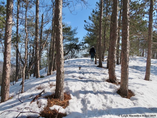In the meantime, after we climbed over the snowbanks to get to the trailhead, we had to conquer the gate. We’ve climbed Peaked in the past, as well as walked the Pudding Pond Trail, both part of the Green Hills Preserve, so we knew that typically one walks around the gate. Today, we merely stepped over it–which tells you something about the snow depth.