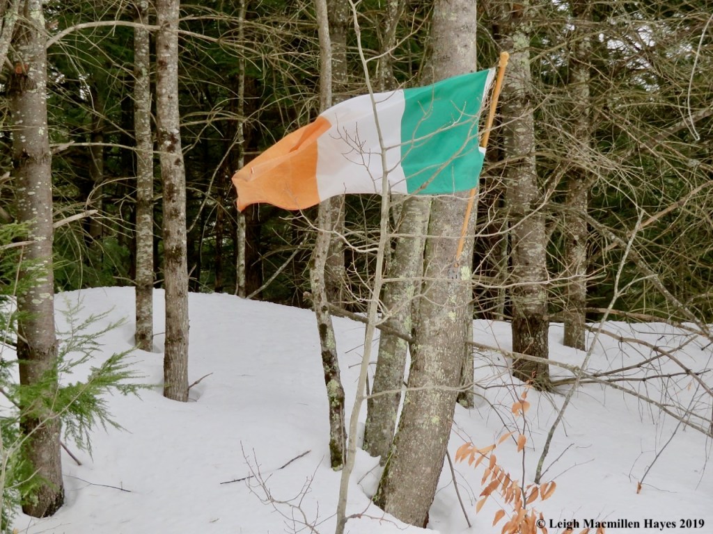 All along the main road to the Greater Lovell Land Trust property, Irish flags decorated random telephone poles and even a tree. The latter was our favorite for the person who hoisted it had to climb up the steep snowbank in order to show off the colors of the Emerald Isle.