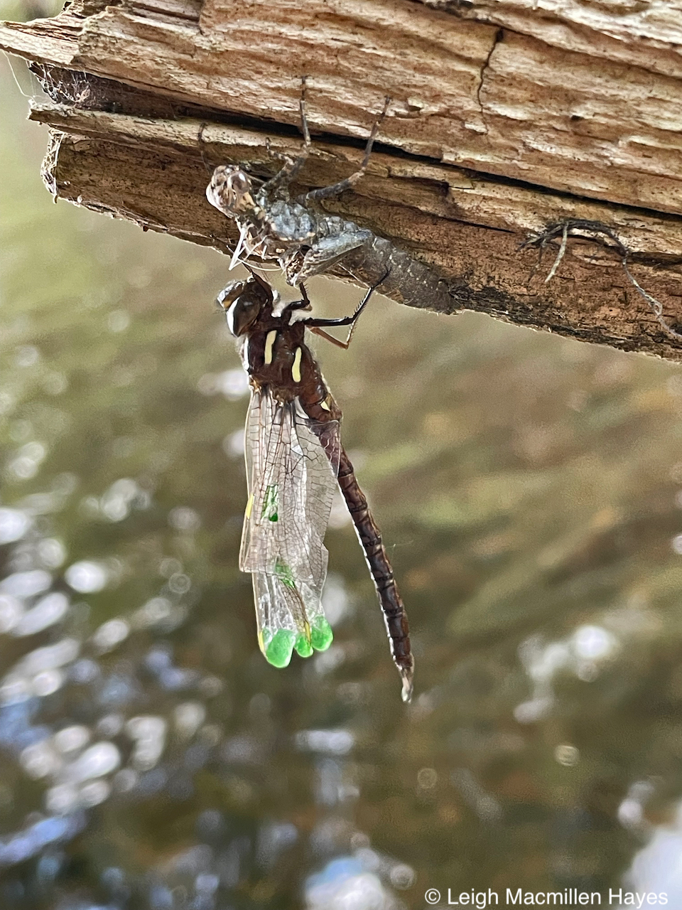 Though I first thought this specimen was dead, suddenly it walked along the underside of an old stump beside the water. Try as I could to separate its wings, I was unsuccessful. For some reason they were stuck together. And one was even folded still as it would have been upon first emerging, thus there was green at its tip, though it appeared at first glance to be in the middle of the wing.