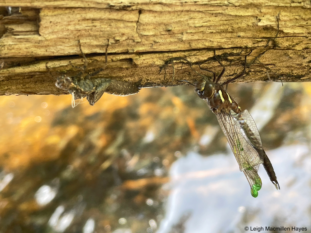 The exciting thing about this week is that several of us had the great opportunity to spy some dragonflies eclosing, the act of emerging from their larval forms. So here’s the deal: fully developed aquatic larvae, aka nymphs, crawl out of the water onto emergent grasses, sedges, shrubs, and rocks, split the back of their skin and emerge as winged adults like the one in view here.