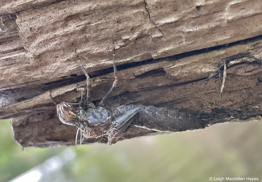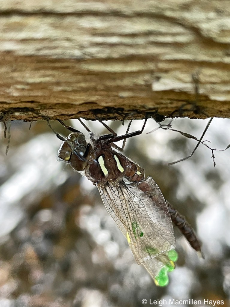 Hemolymph is made up of water and other characteristics like carbohydrates and amino acids, and also pigments, though the latter are typically clear but may be tinged with yellow or green. In the case of this darner, it seems that green is the color of choice. Had it been able to expand its wings, the fluid would have drained out of the wings and back into the body. Usually, it takes about an hour or more for the wings to reach full length and they have a cloudy appearance as the fluid is pumped into them. They are held together over the back, much like a damselfly, but once the fluid drains out of them, the dragonfly is able to extend the wings and there’s a shiny glint to them until they fully dry and stiffen. And then, in a split second, when one such as me is watching, flight happens.