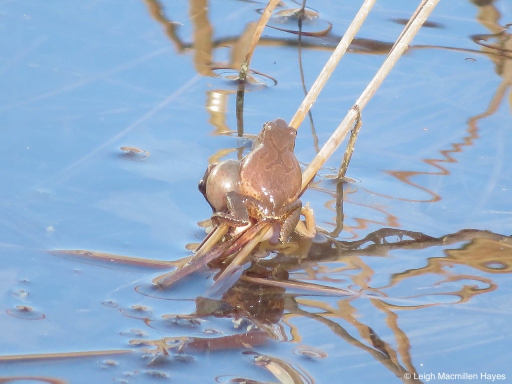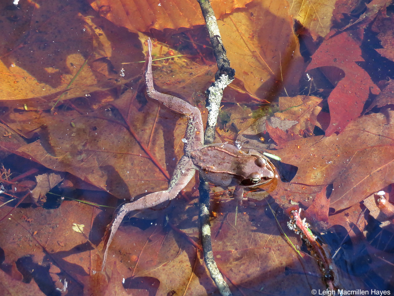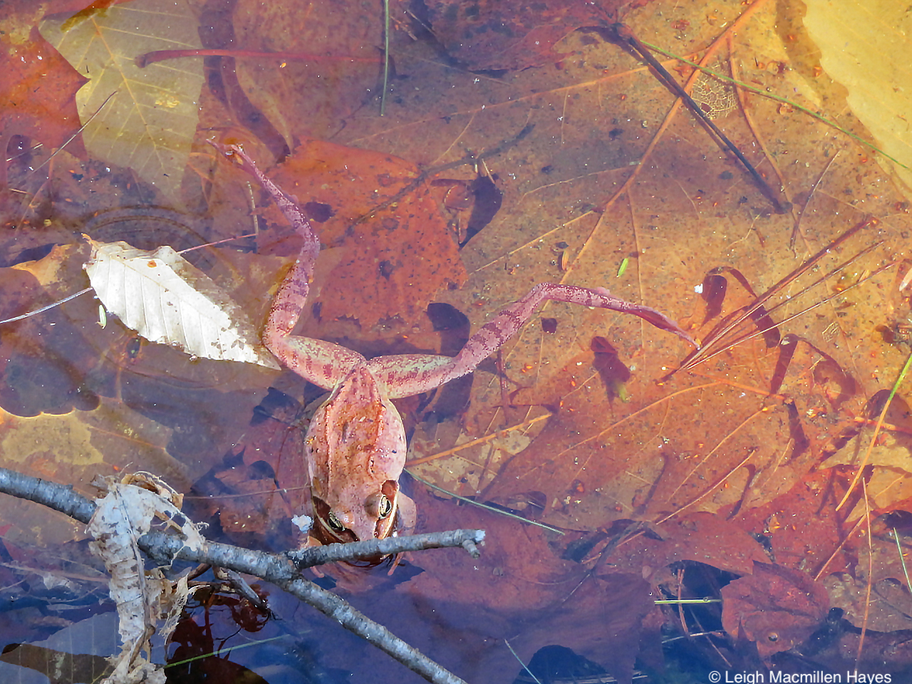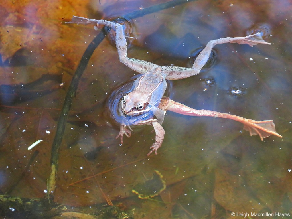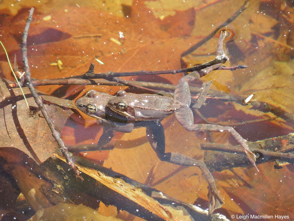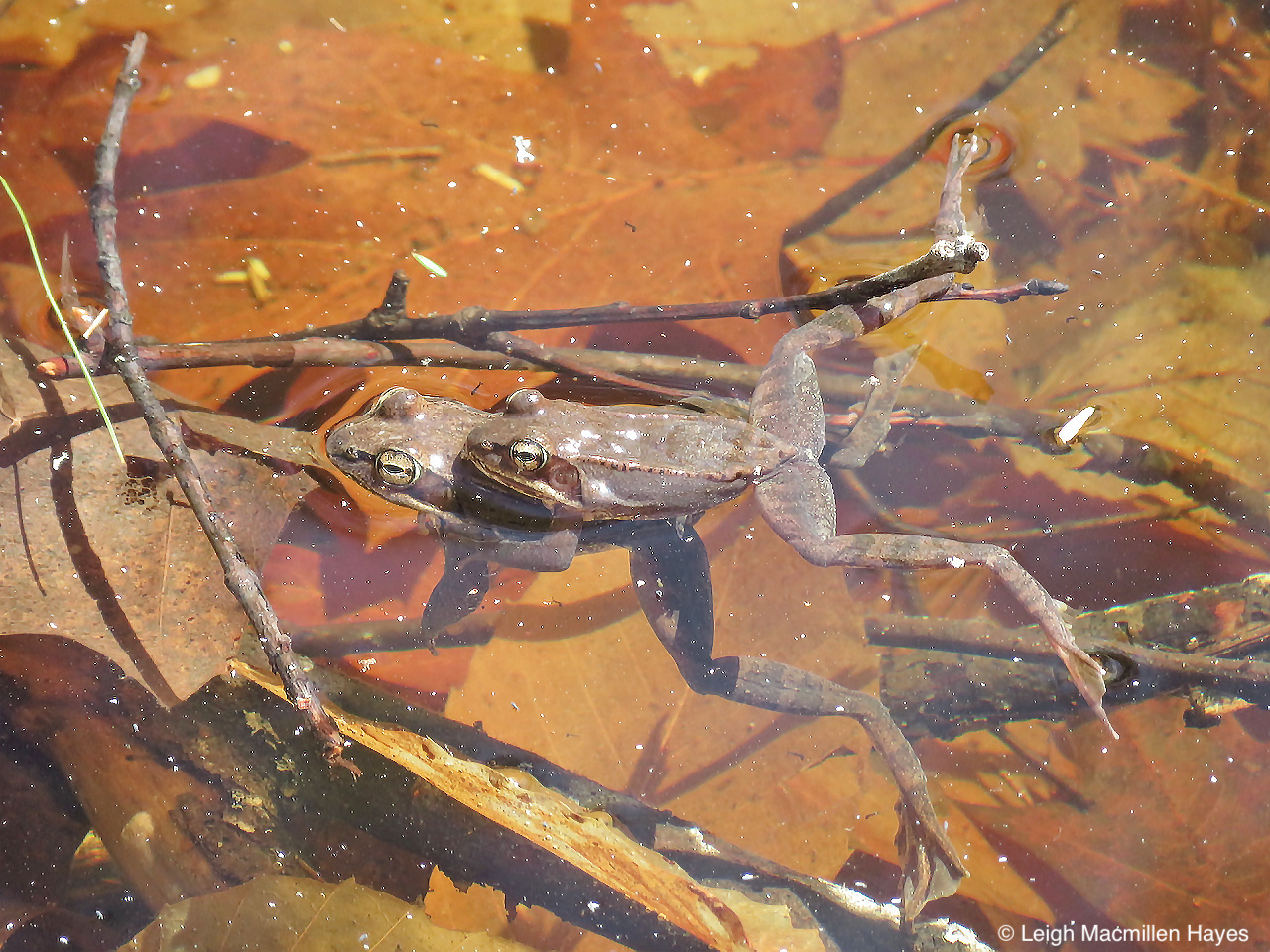 Methinks the breeze was to my benefit because within five minutes frogs began to appear. And among them, this lovely canoodling couple in true Wood Frog form called amplexus. It’s such a great word and means “embrace” for embrace her he does. Notice his foreleg positioned behind hers and her bulging belly. My own excitement increased as I watched these two.