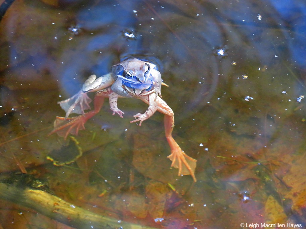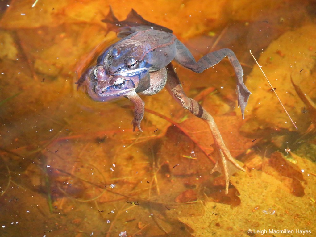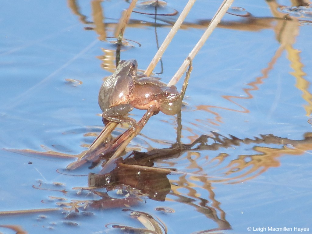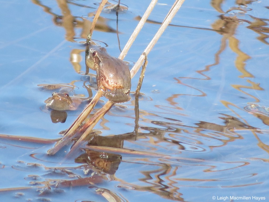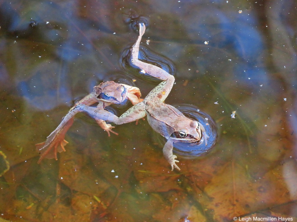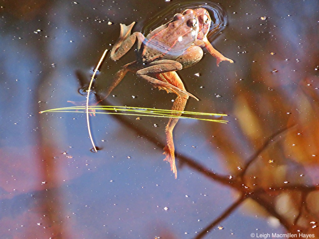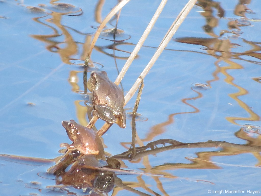 Methinks the breeze was to my benefit because within five minutes frogs began to appear. And among them, this lovely canoodling couple in true Wood Frog form called amplexus. It’s such a great word and means “embrace” for embrace her he does. Notice his foreleg positioned behind hers and her bulging belly. My own excitement increased as I watched these two.