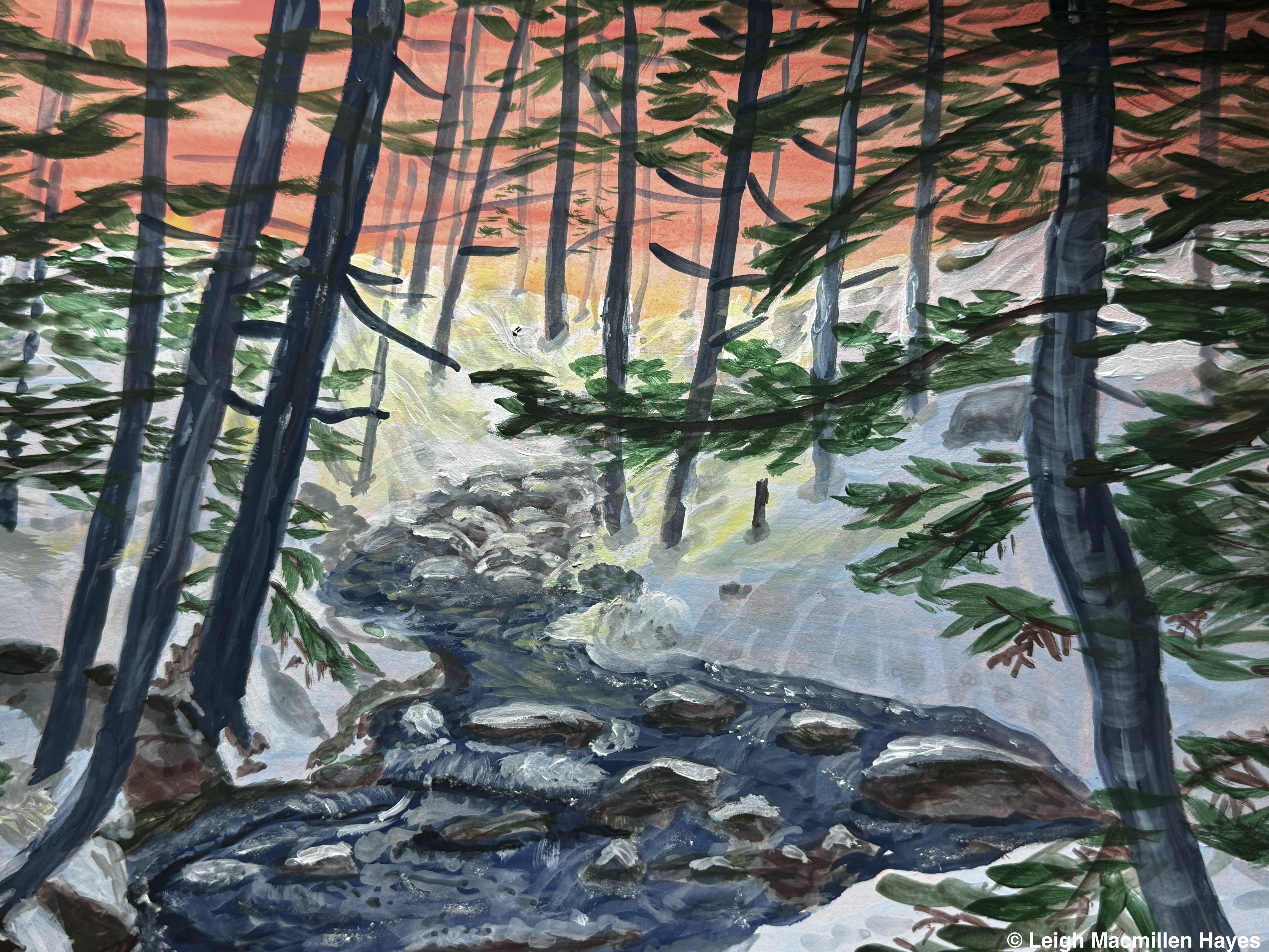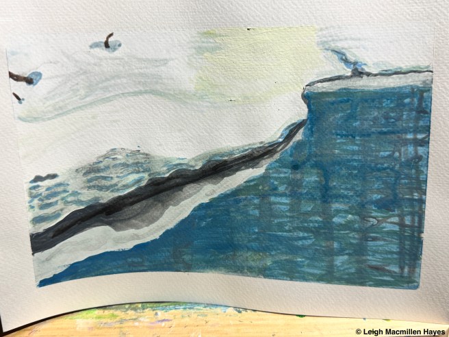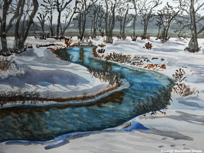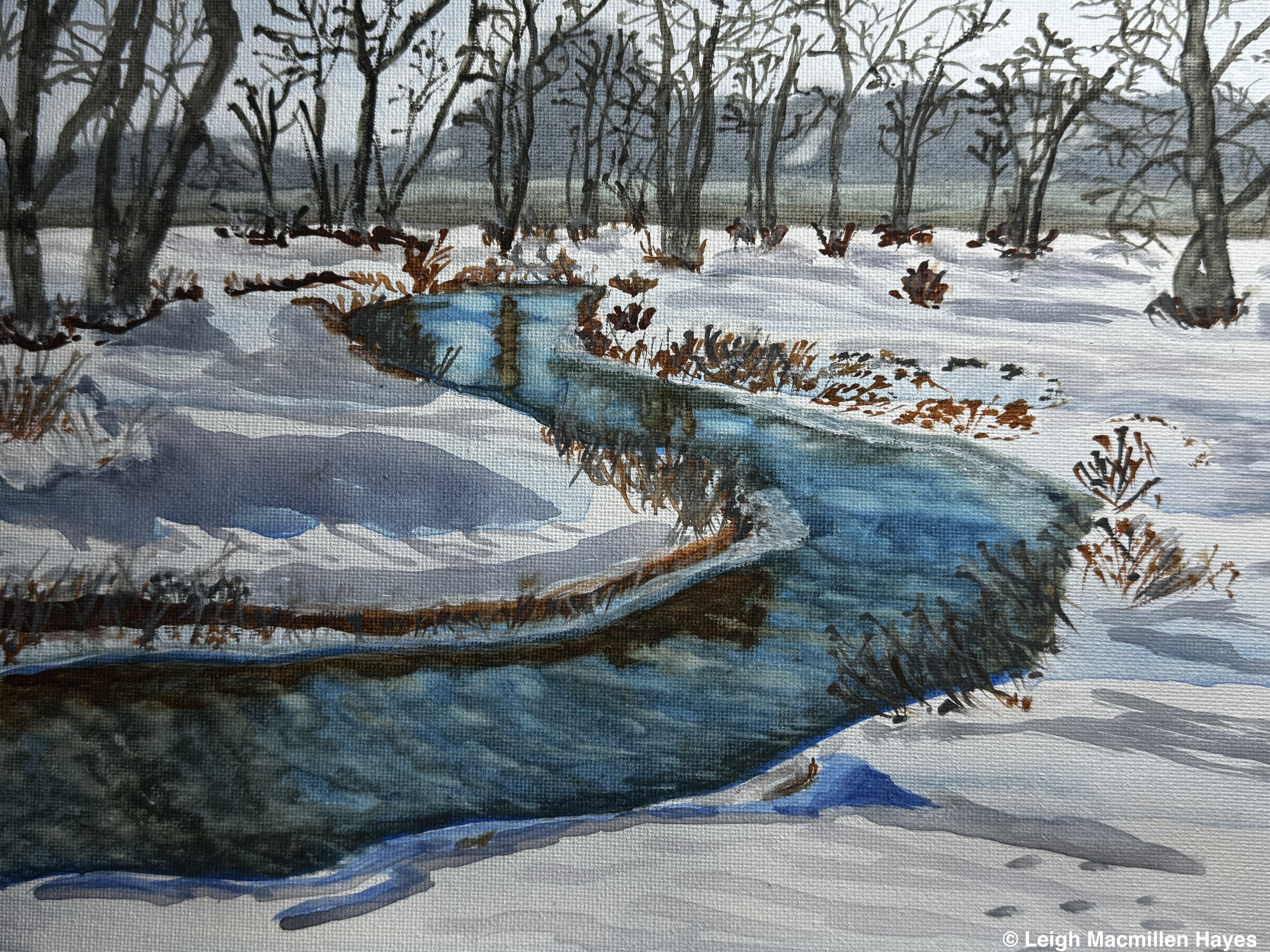 I leave you with this, a watercolor Bruce’s wife Eileen sent me recently. It was inspired by one of our local wetlands.