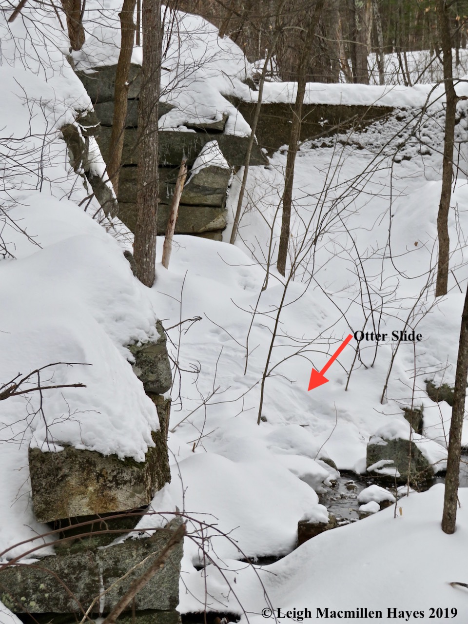 Below the quarry, we found two slides of rocks and between, what might have been a “roadway” used by oxen pulling sleds in the winter to haul the stone out. We followed it for a few minutes because we thought we’d spied the Narrow Gauge Train Track below, but realized we were fooled by a few patches of reindeer lichen that were lighter in color than the surrounding woods, thus mimicking an open route. One of these days, we’ll explore further. The question remains: Was the rock quarried here and used to support the rail track at certain points along the way, or was it shipped out via train to other destinations?
