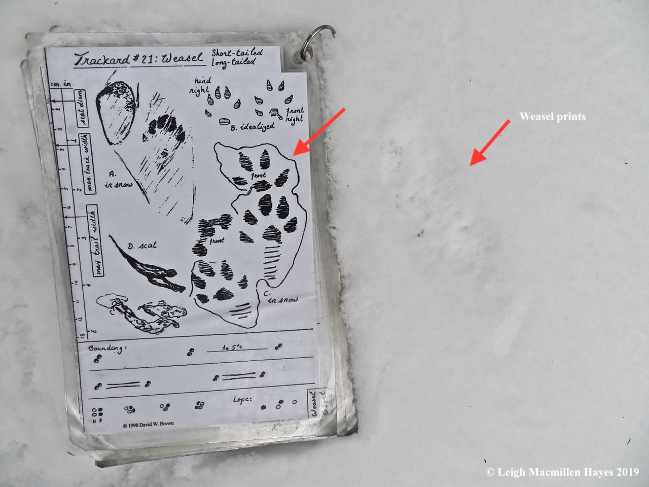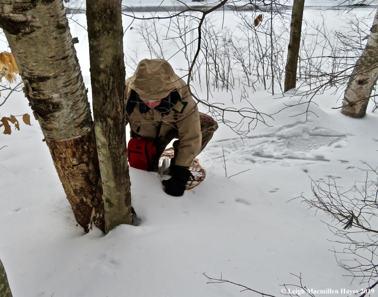 There are no trails yet and so after parking, we followed the road back a ways to the area of our winter expedition. And what to our wondering eyes did we spy on the road? Moose prints! One should always look through a magnifying glass to make certain the ID is correct. Wes confirmed our suspicion.