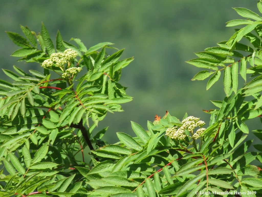 While we waited, I honed in on the newly formed flowers of Mountain Ash. I love these trees for the red stems of their leaves and fruits to come.