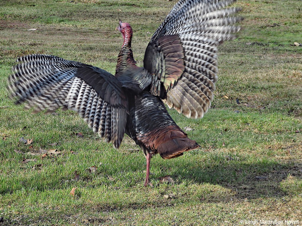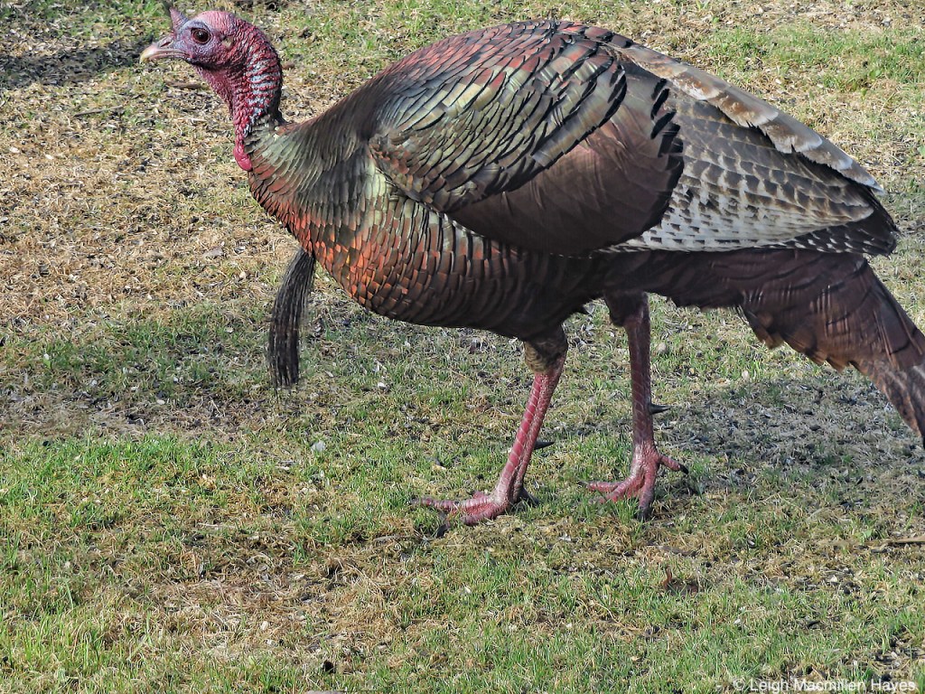 No, it’s not my guy, but another handsome fellow named Jake. At least I think that’s his name, based on the length of his beard, short conical spurs on the backs of his legs, and light red and blue head, which would be much brighter for his elder named Tom. It doesn’t matter for in the morning sunlight he gleams and makes me realize that he embodies every color of the rainbow.