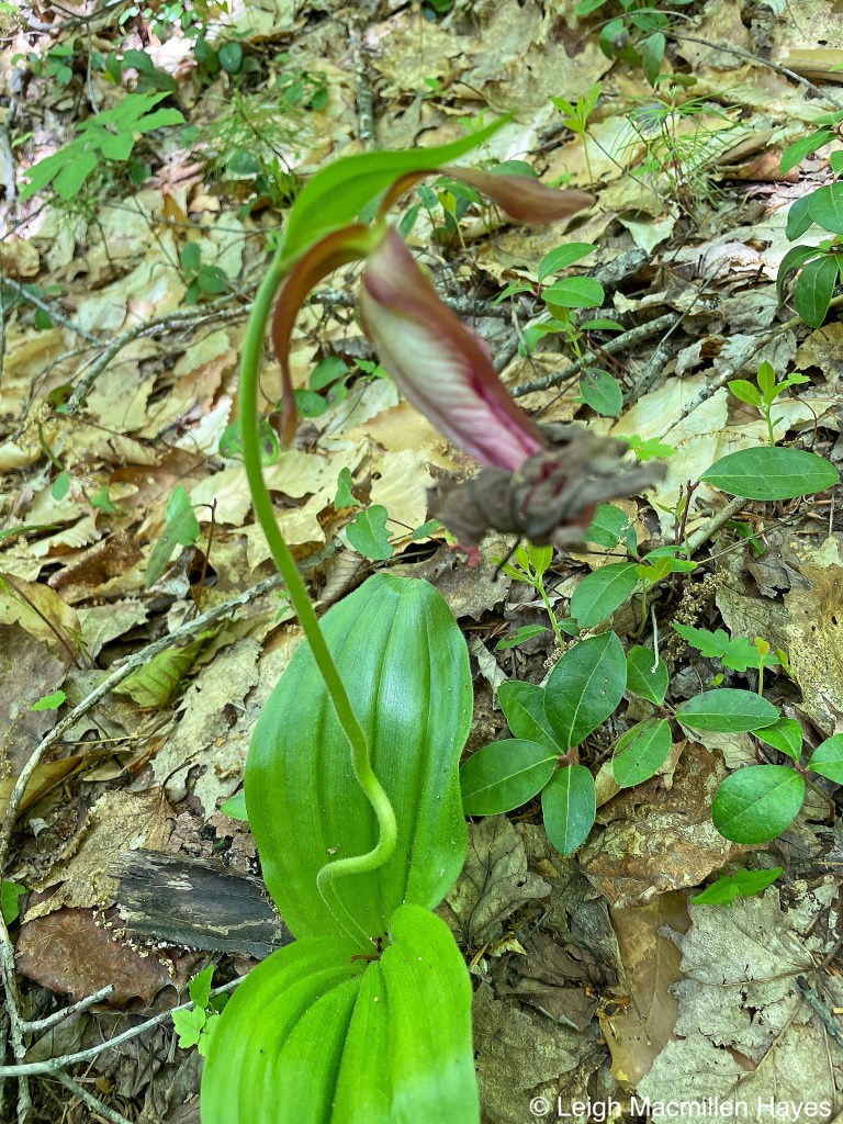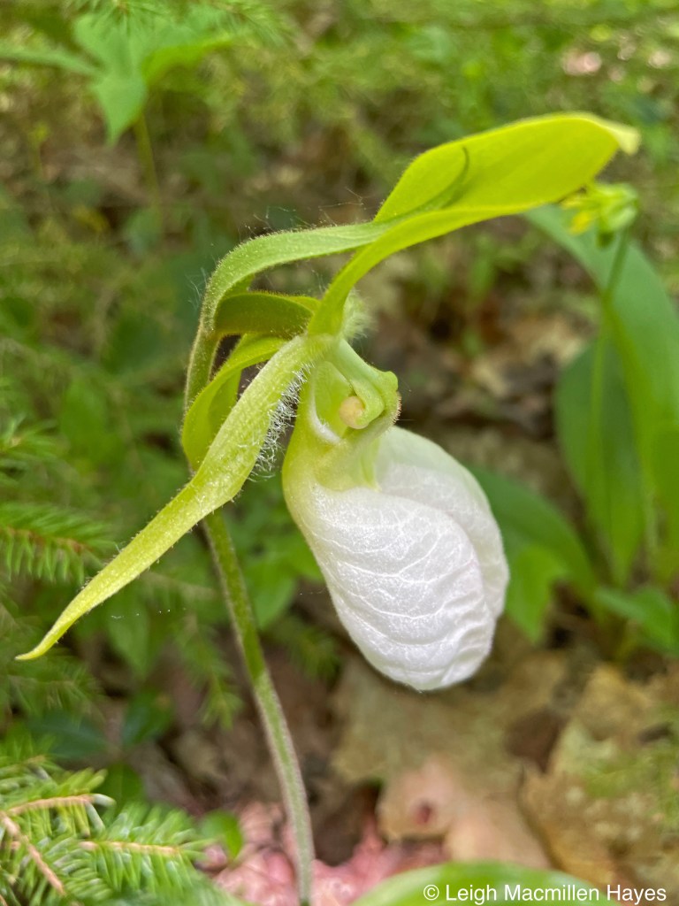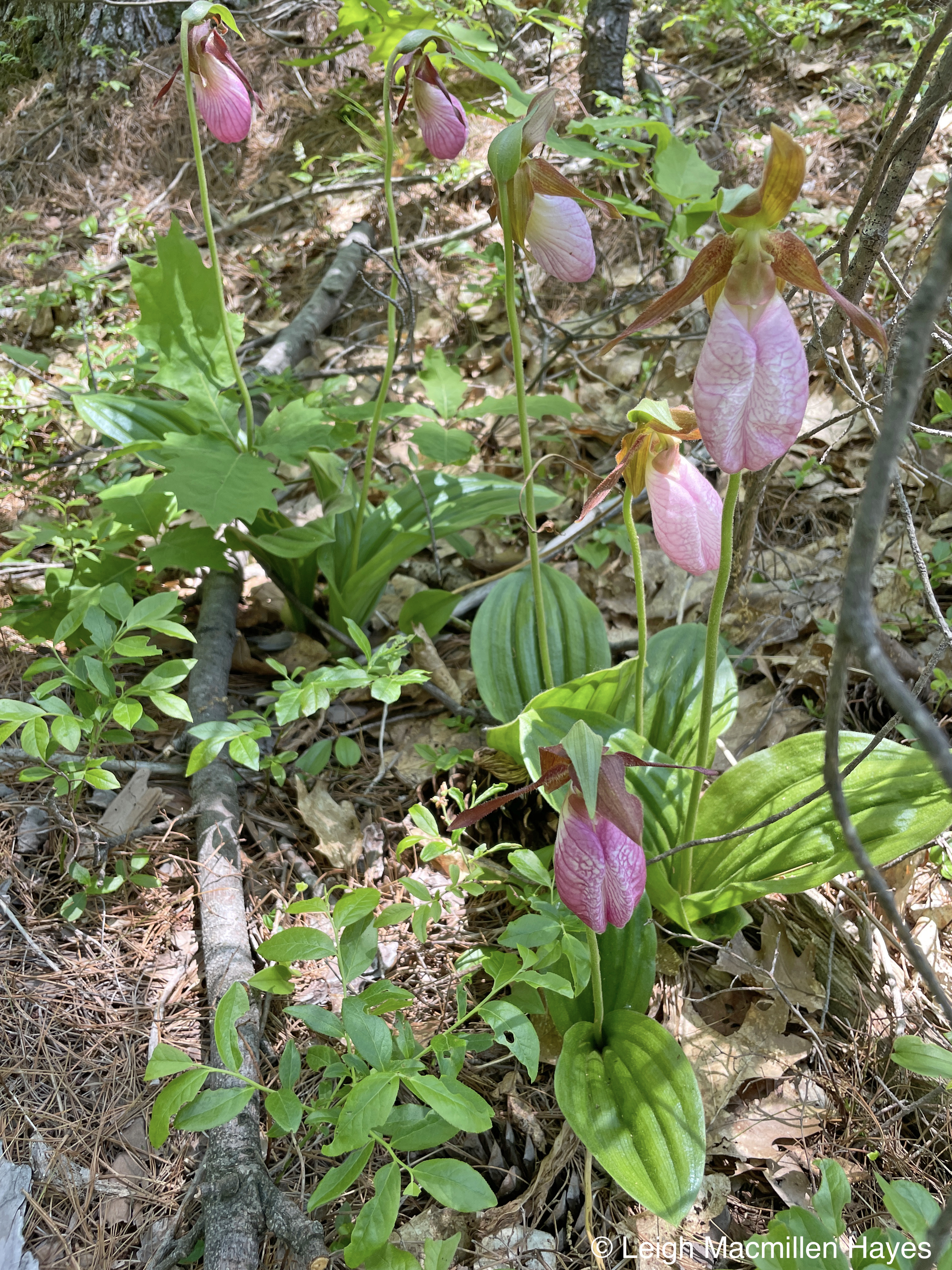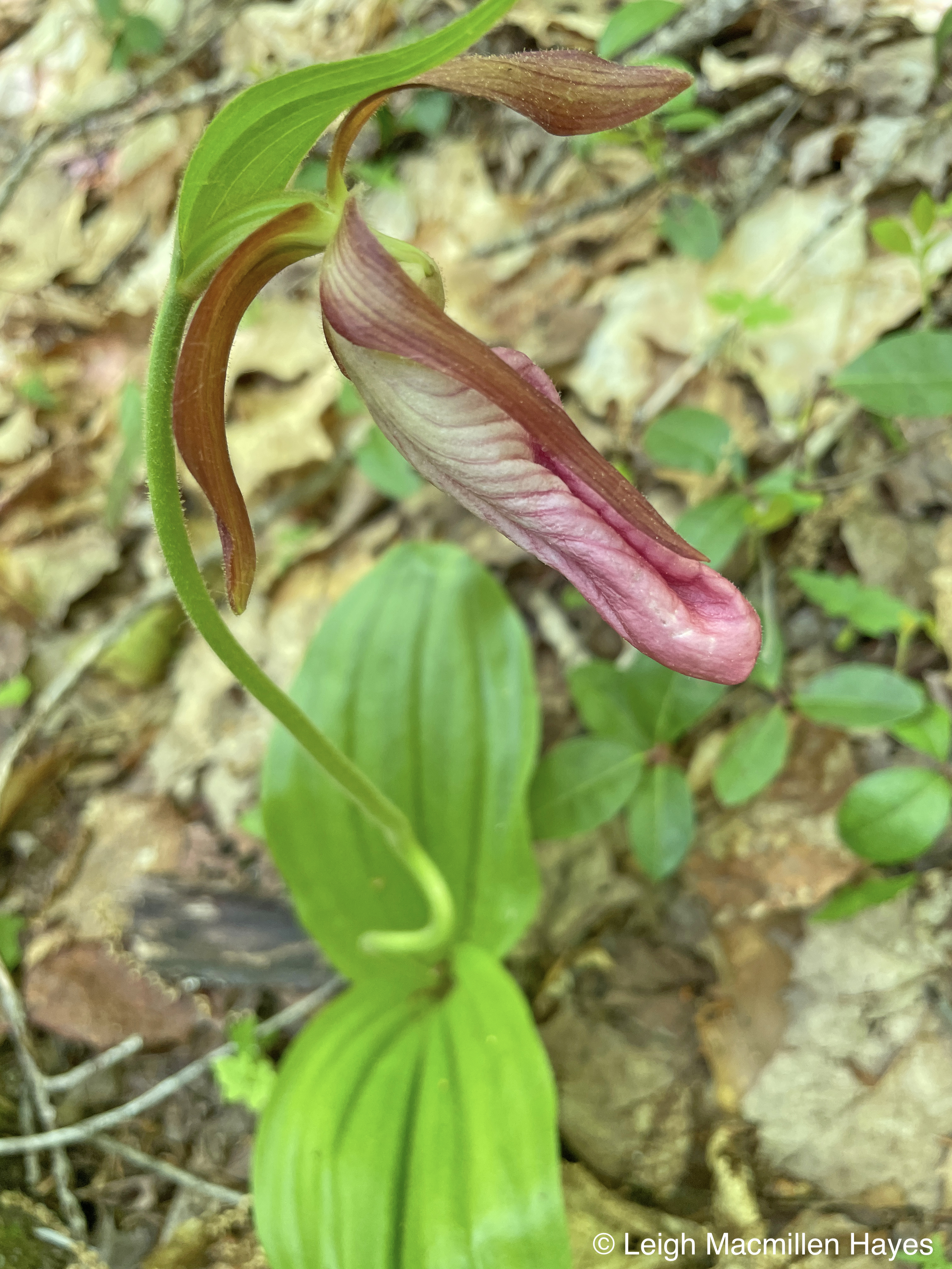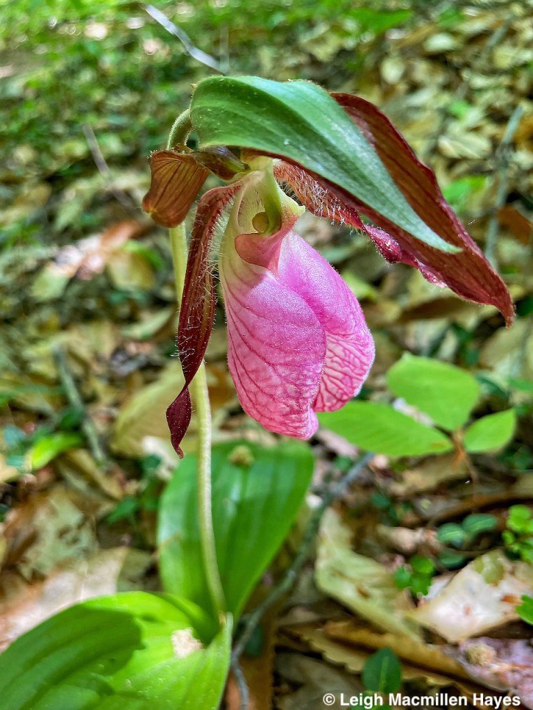 And so it was that not long after we left the trailhead, we met the first lady of our intentions. She was classic–her pink slipper-like pouch inflated and darkly veined (in a manner that reminded me of a pitcher plant’s veins), her sepals and upper petals purply-bronze, stem hairy, and the set of basal leaves well ribbed. With that, we got excited, announced her as number one, and couldn’t wait to continue the count.