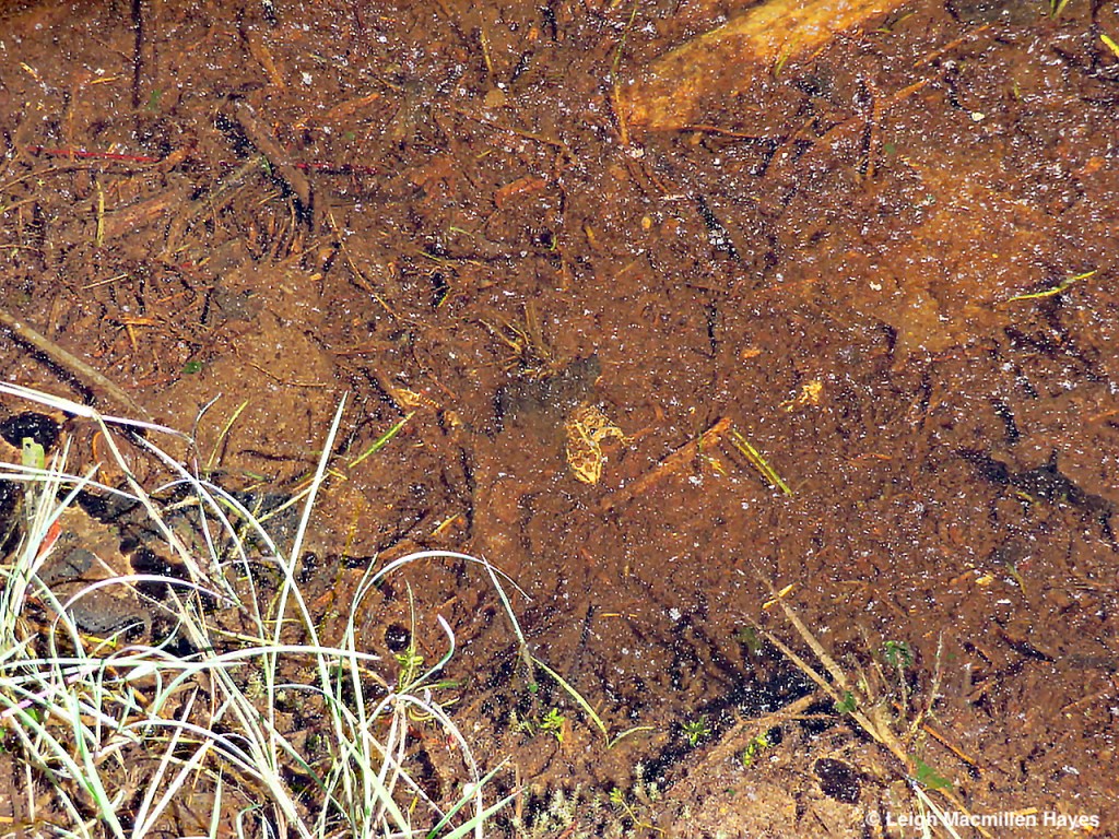 But at the dam we did pause, at which point several large tadpoles disappeared and a frog jumped into the muck to hide from us. Do you see him? By his dark angular spots, rather than dark rounded spots surrounded by a light ring did I know his name to be Pickerel.
