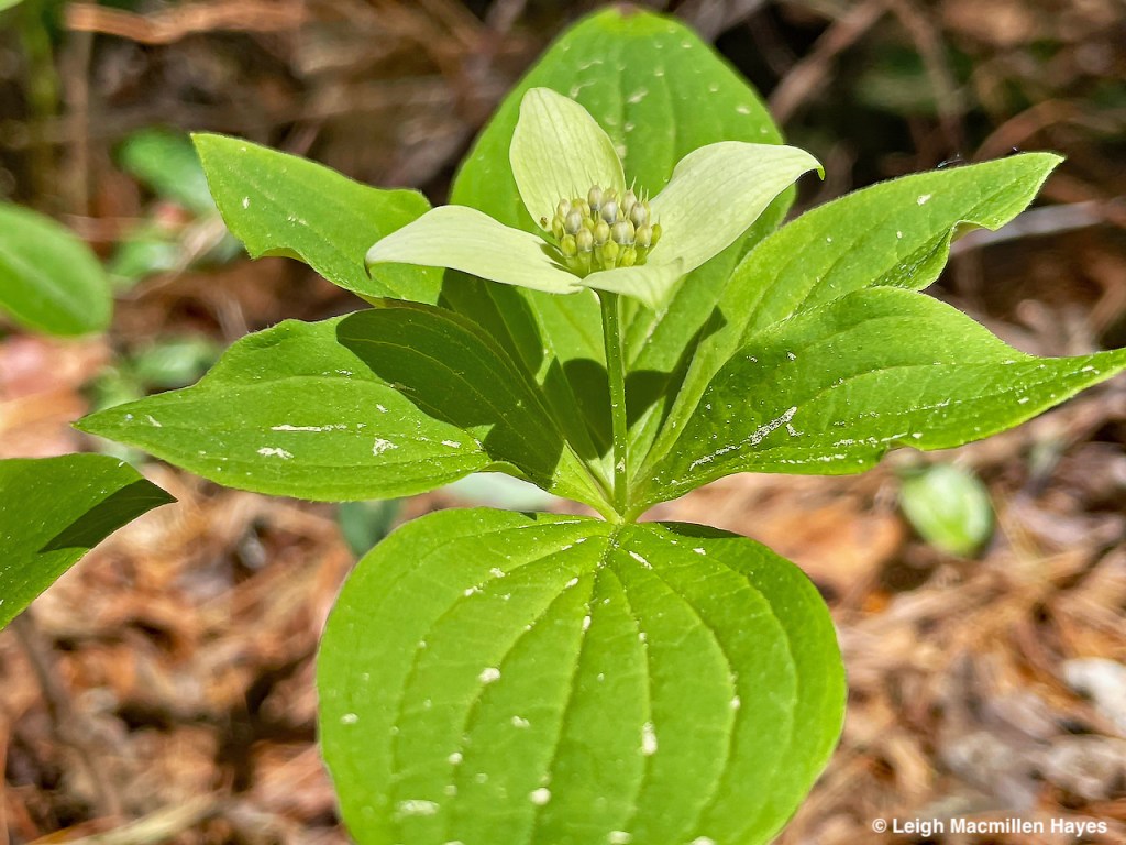 My heart cheered at the sight of this little one, a Bunchberry. While the plant seems to sport a single flower, it’s “flower” is a series of four large petal-like bracts, surrounding the actual flowers, which are tiny and greenish, with four minute petals. Like the Indian Cucumber-root, this plant needs more leaves when it’s ready to flower, so instead of the usual leaves of four, flowering Bunchberries have two extra large leaves to help the cause.