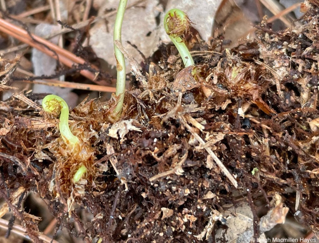 Last year’s sori (group of spores) were still visible on the underside of some leaves. The sori located in rows on each side of the mid-vein, are circular, orangish brown and not covered by tissue (indusium).