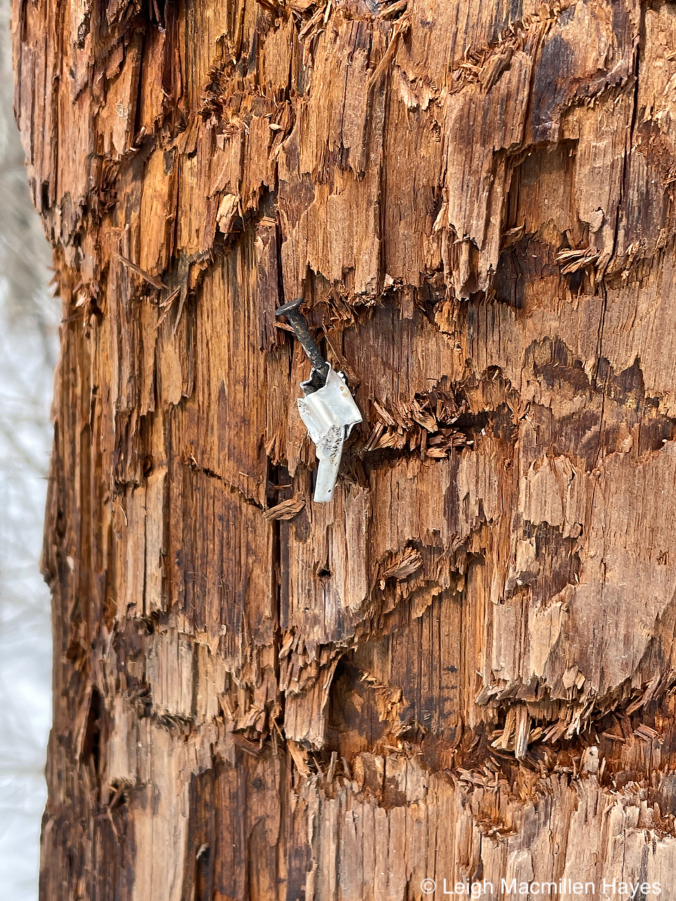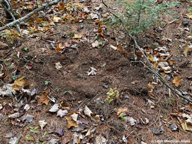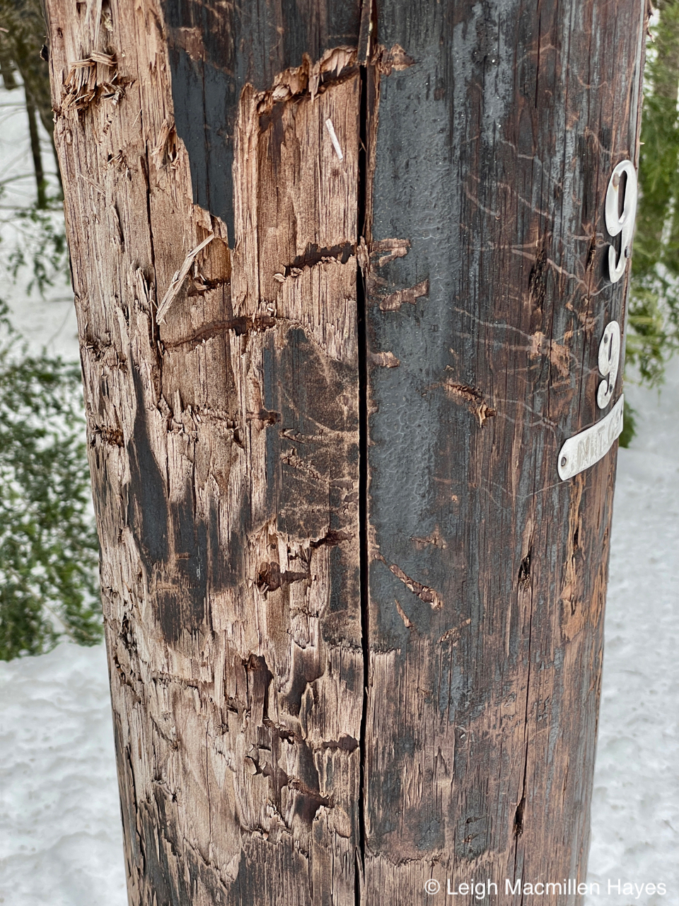 What intrigued me though? I mean, seriously, a telephone pole in the middle of the woods interests a so-called naturalist? YUP! All of those marks you see below the mangled number are the bite marks and scratch marks of a Black Bear. The bear turns its head to the side and then scrapes the bark with its upper incisors coming to meet its lower incisors.